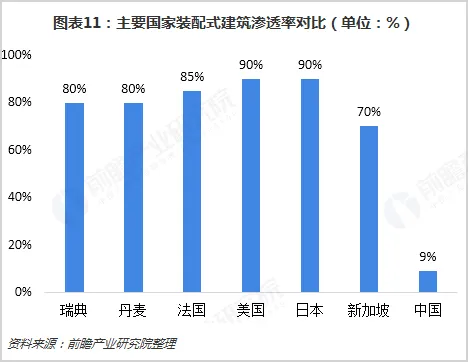 但是西方发达国家的装配式建筑经过几十年甚至上百年的时间,已经发展到了相对成熟、完善的阶段,日本、美国、澳大利亚、法国、瑞典、丹麦是最具典型性的国家,装配式建筑渗透率已经高于70%。日本是率先在工厂中批量生产住宅的国家,美国注重住宅的舒适性、多样性和个性化,法国是世界上推行工业化建筑最早的国家。
