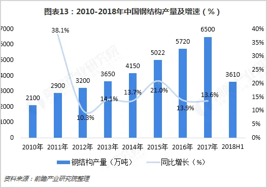 钢结构产量的增加主要是受国内需求旺盛的拉动,预计2018年钢结构产量将超过7000万吨。钢结构行业的稳步发展为钢结构在装配式建筑中的应用带来利好。
