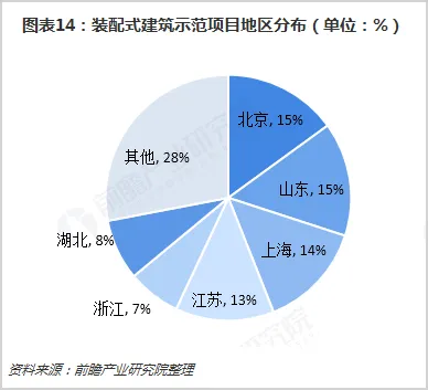 从区域分布看,北京市和山东省装配式建筑项目较多,占全国装配式建筑项目的比重均为15%;其次是上海和江苏、浙江地区,项目占比分别是14%、13%和7%;湖北省装配式建筑项目占比为8%。