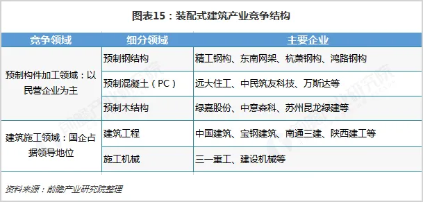 竞争结构:构件加工以民营企业为主,国企占据建筑装配市场领导地位。装配式建筑产业链的重点环节在于预制件的生产制造和建筑施工安装部分,从市场参与主体来看,主要包括构件加工企业和建筑安装施工企业。