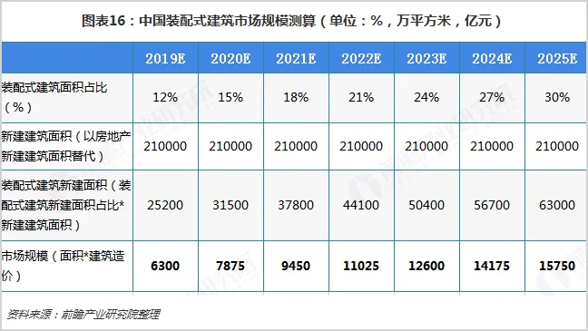根据住建部发布的装配式建筑造价参考依据,以2500元/平方米(考虑到技术水平上升和物价提高对价格水平带来的不同影响,假设未来几年造价不变)为基础,以房地产新建建筑面积替代城镇新建建筑面积进行测算,及至2025年我国装配式建筑市场规模将达到15000亿元以上。