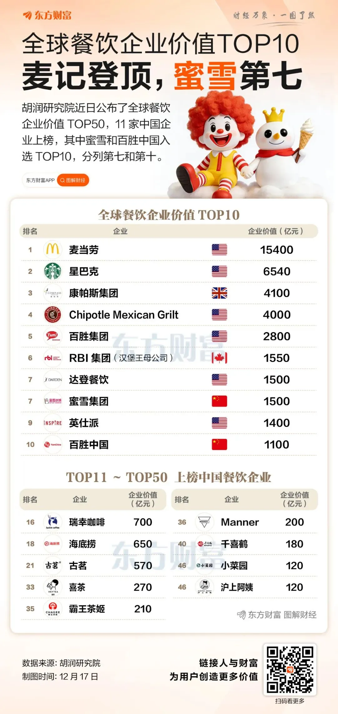 胡润研究院近日公布了全球餐饮企业价值TOP50榜,11家中国企业上榜,其中价值1500亿元的蜜雪集团和价值1100亿元的百胜中国入选TOP10,分列第七和第十。换言之,蜜雪也是中国最具价值的餐饮企业。