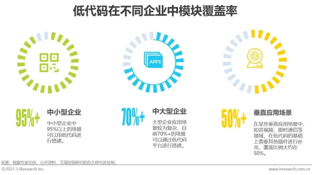 低代码在不同企业中模块的覆盖率不同。中小企业由于应用复杂度低、业务流程相对简单等原因,95%的应用场景均可用低代码来完成。且低代码产品灵活性高,便于企业应用功能拓展,能适应中小型企业快速发展中频繁的功能迭代需求,让创新更快落地。中大型企业中低代码目前可覆盖70%的应用场景,中大型企业通常需要建立新系统时与企业原系统进行信息联通,或是对原有系统进行二次开发,其中的逻辑设计和结构较为复杂。低代码有大量场景应用模块和行业插件,可以帮助中大型企业进行个性化应用的搭建,打通企业内部数据连接。音视频、即时通信等垂直领域,在低代码搭建应用的基础上还需要其他插件进行功能补充,目前在垂直应用场景照片那个低代码的功能可覆盖约50%。