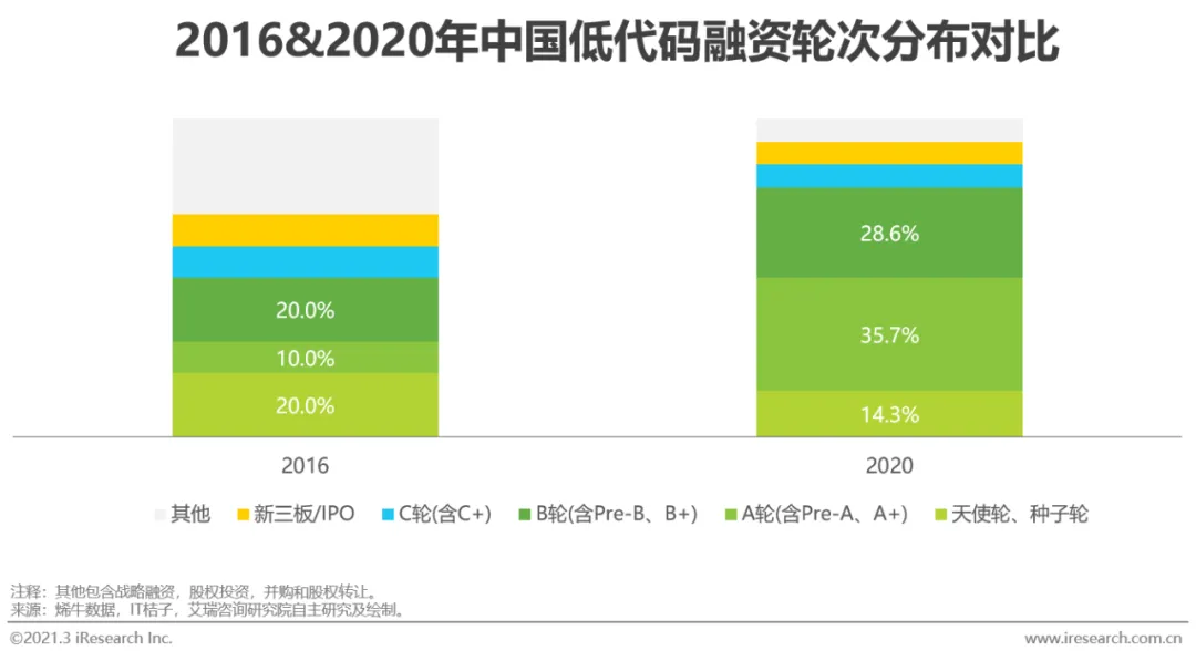 2016年开始低代码概念开始从国内逐渐兴起,当年低代码相关产品投融资事件达10起,至2020年中国低代码市场共有59起投融资事件,其中亿元以上融资有13起。2016年开始低代码投融资笔数整体呈上升趋势,亿元以上融资维持在每年2-3笔。从融资轮次上看,2020年C轮以前融资占比78.6%,相比2016年上升了28.6个百分点,说明低代码市场整体处于发展初期,初创企业多,增长速度快。投融资结构上看,初创企业的投融资热度提升,成为企业投资重点。随着企业对系统敏捷性、易用性需求的增加和对业务部门低代码接受度的提升,市场会迎来新的发展契机,短期内投融资热度将持续增长。