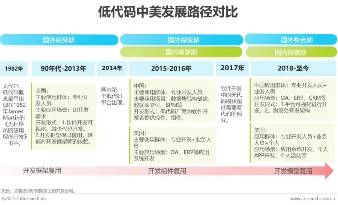 低代码概念雏形最早出现在1982年James Martin的《无程序员的应用程序开发》一书中,美国在低代码产品的研究过程较长,并积累了丰富的技术模型和落地经验,历经早期萌芽期、探索期,当前已进入到国外巨头整合阶段。而中国则是2014年出现了第一个低代码平台产品,产品应用路径从早期的数据库交付、数据集结构搭建逐渐抽象出各种流程引擎,可视化界面等,而应用也从BPM延伸到更复杂的应用场景如ERP、CRM等应用系统的搭建。低代码平台的使用门槛也在逐步降低,从原来的专业开发人员过渡到业务人员,甚至个人也可以进行自行开发应用软件。但相对美国,行业整体仍然较为分散。