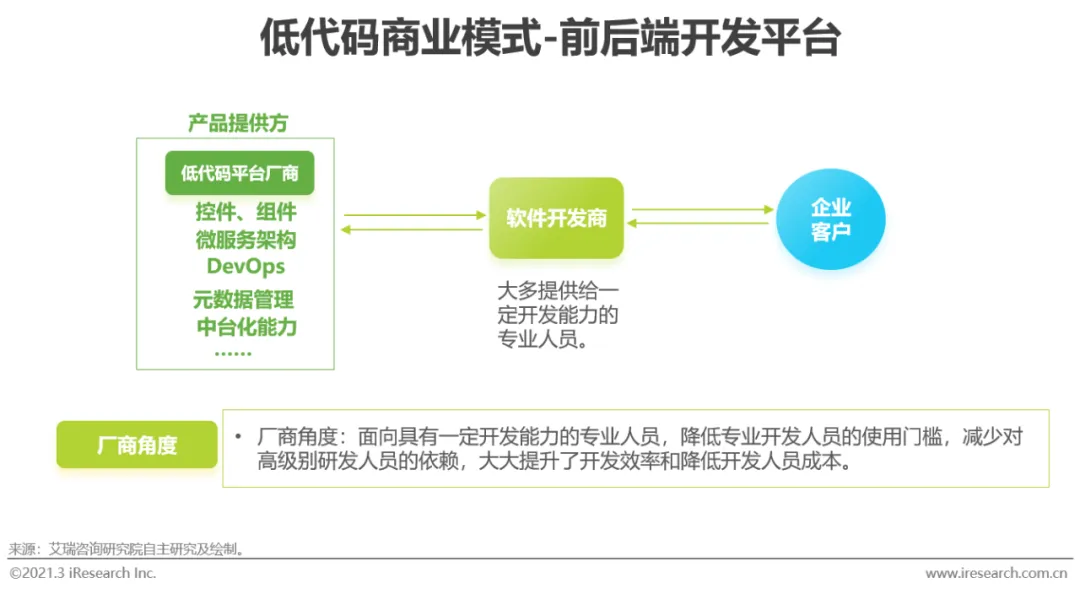 第三种商业模式为低代码平台厂商面向软件开发商或者具备一定开发能力的专业人员,该类厂商更多提供前端或后端开发服务所需要的框架、插件、控件、组件等工具,利用云原生、微服务架构、DevOps等理念帮助软件开发厂商提升开发效率。有的平台甚至可以实现零代码自动化开发、运维等,大大减少了专业开发人员对于代码的编写。降低高级版开发工程师的使用,节约了开发成本。