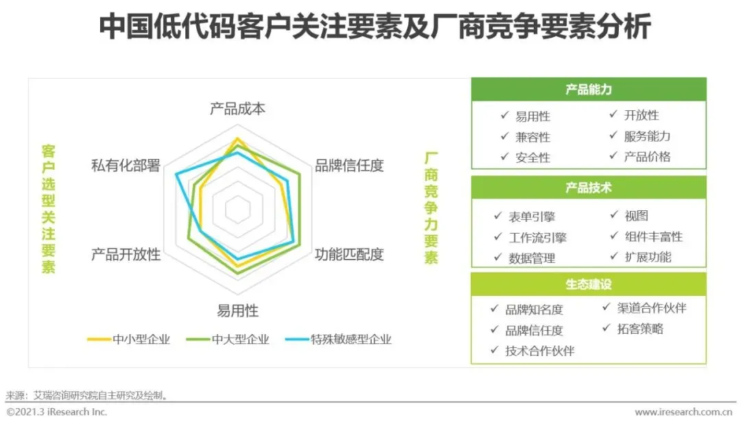 低代码尚处于发展早期,市场和客户认知仍需培育,各厂商也在不同的竞争维度中丰满羽翼。从客户角度看,不同规模和类型企业对低代码厂商的关注侧重点不同,在满足产品功能与需求匹配的前提下,中大型企业应用更为多样复杂,需要培训人员指导,并将低代码平台作为开发工具长期使用,因此厂商信任度非常重要。中小型企业受制于企业自身发展,相对厂商品牌更看重产品性价比高低,此外,一些特殊敏感型企业如军工、政府、金融等,更加看重私有化部署的能力。由此看来,针对企业服务客户类型,不断加大在品牌影响力、产品功能、性价比等维度的投入,将会形成企业在客户心中的定心丸,增加客户对品牌和产品的忠实度。
