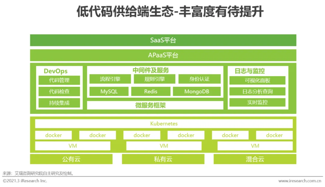 从供给端来看,低代码生态主要集中在云计算产业链上,在底层部署上可以实现私有云、公有云、混合云多种部署方式,满足不同行业客户需求。在低代码的核心APaaS层,产品相关应用主要涉及到各种引擎、数据库等中间件,以及DevOps和监控安全等服务。目前越来越多的底层框架采用更加灵活的微服务架构,使得低代码可以更好的完成二次开发和应用拓展。SaaS层产品如ERP、CRM、HRM等可以满足跨行业、跨部门的通用性需求,未来随着APaaS层引擎种类的增加、底层架构模型的完善、应用模板的丰富度提升,低代码将赋予SaaS应用更多能力。