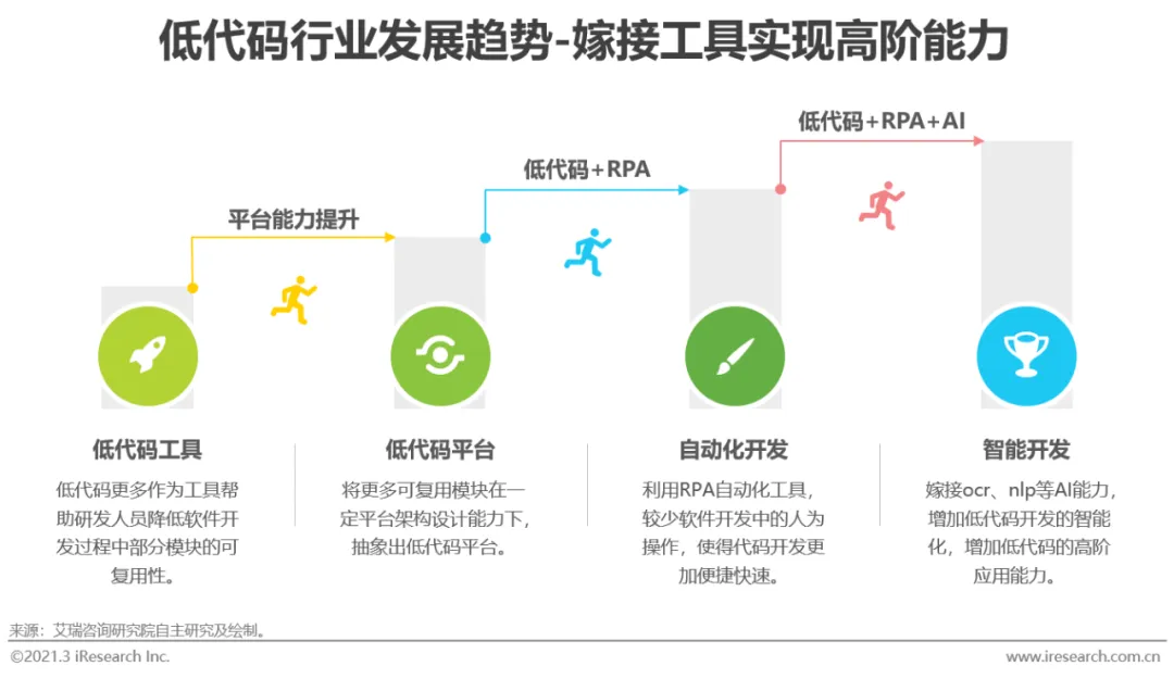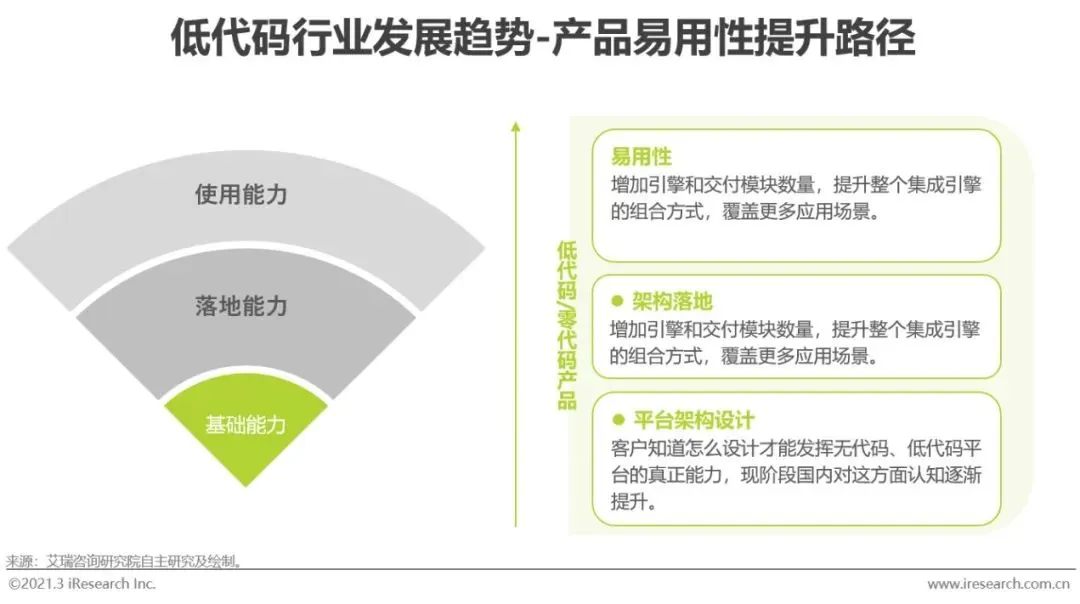低代码平台是在各种组件和模块实现无代码化的基础上发展起来的,早期是数据库管理、报表管理等单点能力突破。随着产品架构的设计能力和落地能力提升,低代码由组件的无代码化向平台形式转变。未来随着引擎种类和交付模块数量的增加,低代码平台将会覆盖更多应用场景,实现更大范围的业务价值。除了集成性以外,产品的自定义能力也将是低代码厂商未来重点关注的方向,在众多个性化和细分行业应用场景中,产品的灵活度和可拓展性是客户主要考虑因素之一。因此,低代码厂商将更加关注低代码平台的完整度和自定义能力,提升低代码产品的易用性和灵活度。