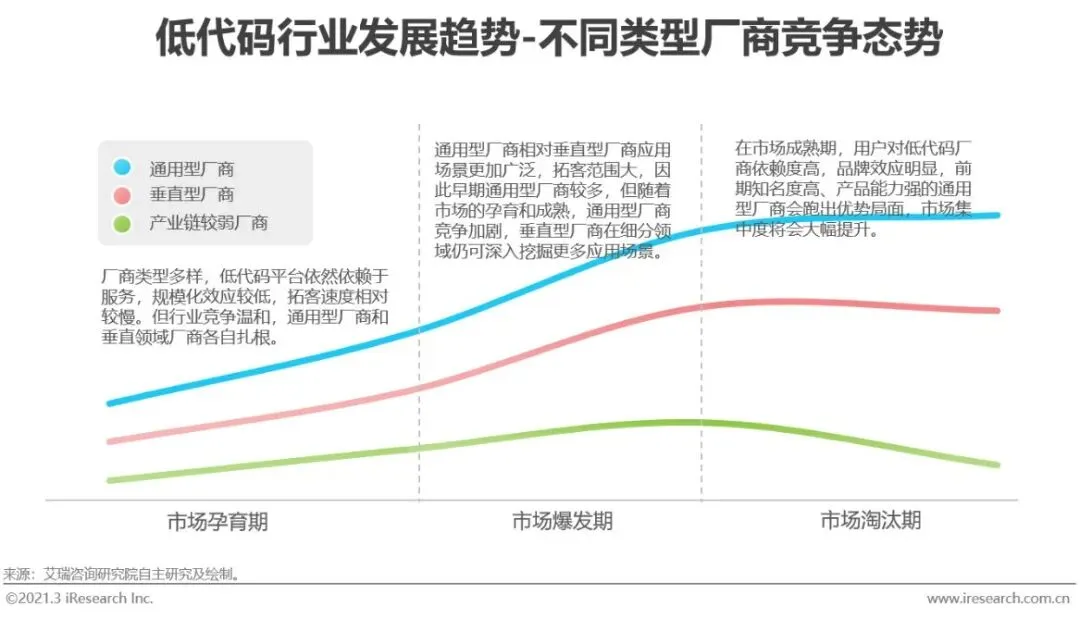 在低代码市场发展早期,厂商类型多样化,传统软件厂商、SaaS厂商、云厂商等纷纷涉足低代码领域,希望借助低代码平台完成对内和对外的高效开发。早期低代码平台依然依赖于服务,规模化效应较低,拓客速度相对较慢。通用型厂商相对垂直型厂商应用场景更加广泛,因此厂商数量更多。但随着市场的孕育和成熟,通用型厂商竞争加剧,垂直型厂商在细分领域的优势渐显,可以进一步深挖用户场景并不断提升客户满意度。在市场成熟期,用户对低代码厂商依赖度高,品牌效应明显,前期知名度高、产品能力强的通用型厂商会跑出优势局面,市场集中度将会大幅提升。因此,及早布局低代码产业链生态,多维度拓展厂商优势,才能在将来竞争中占据高地。