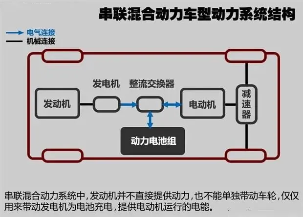 串联式混合动力电动汽车的发动机能够经常保持在稳定、高效、低污染的运转状态,使得排放气体控制在尽可能低的范围,其从总体结构上看比较简单,易于控制,其特点更加趋近于纯电动汽车,适合于城市道路中频繁起步和低速运行的状态。