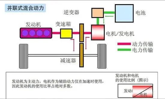 与串联混合动力结构相比,并联混合动力结构可采用功率相对较小的驱动电机和电池组,减少汽车的成本和质量。在纯电模式下,噪音低,使用成本小,在混动模式下,起步加速性能出色,但发动机不能保证一直处于效率最高的工况环境下工作,在低速工况下燃油经济性和排放性能均不及串联式混合动力系统。