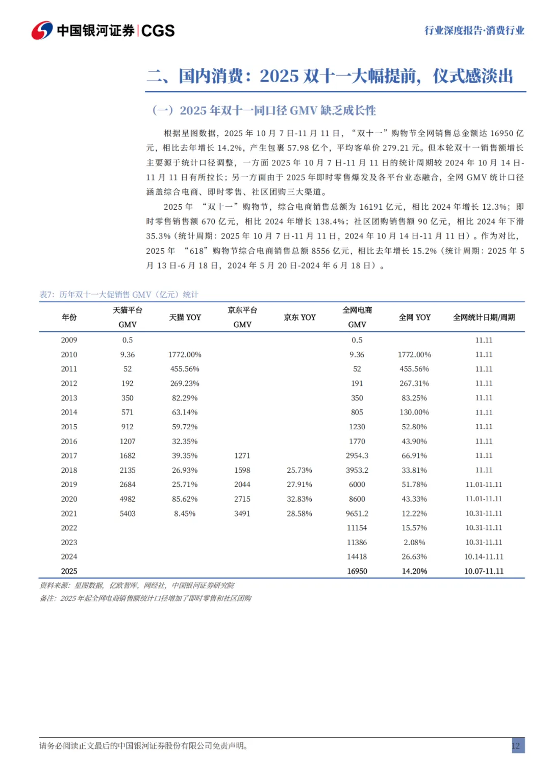 线上消费方面,2025年双十一购物节统计口径调整,涵盖综合电商、即时零售、社区团购三大渠道,全网销售总额达16950亿元,但同口径下缺乏明显成长性。促销周期拉长导致“仪式感”淡出,消费者对“全年最低价”认知弱化,平台和企业对GMV宣传趋于谨慎。
