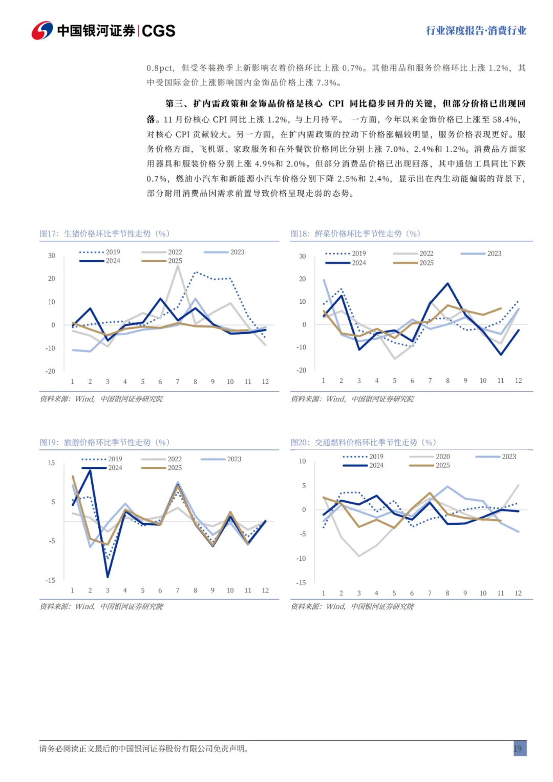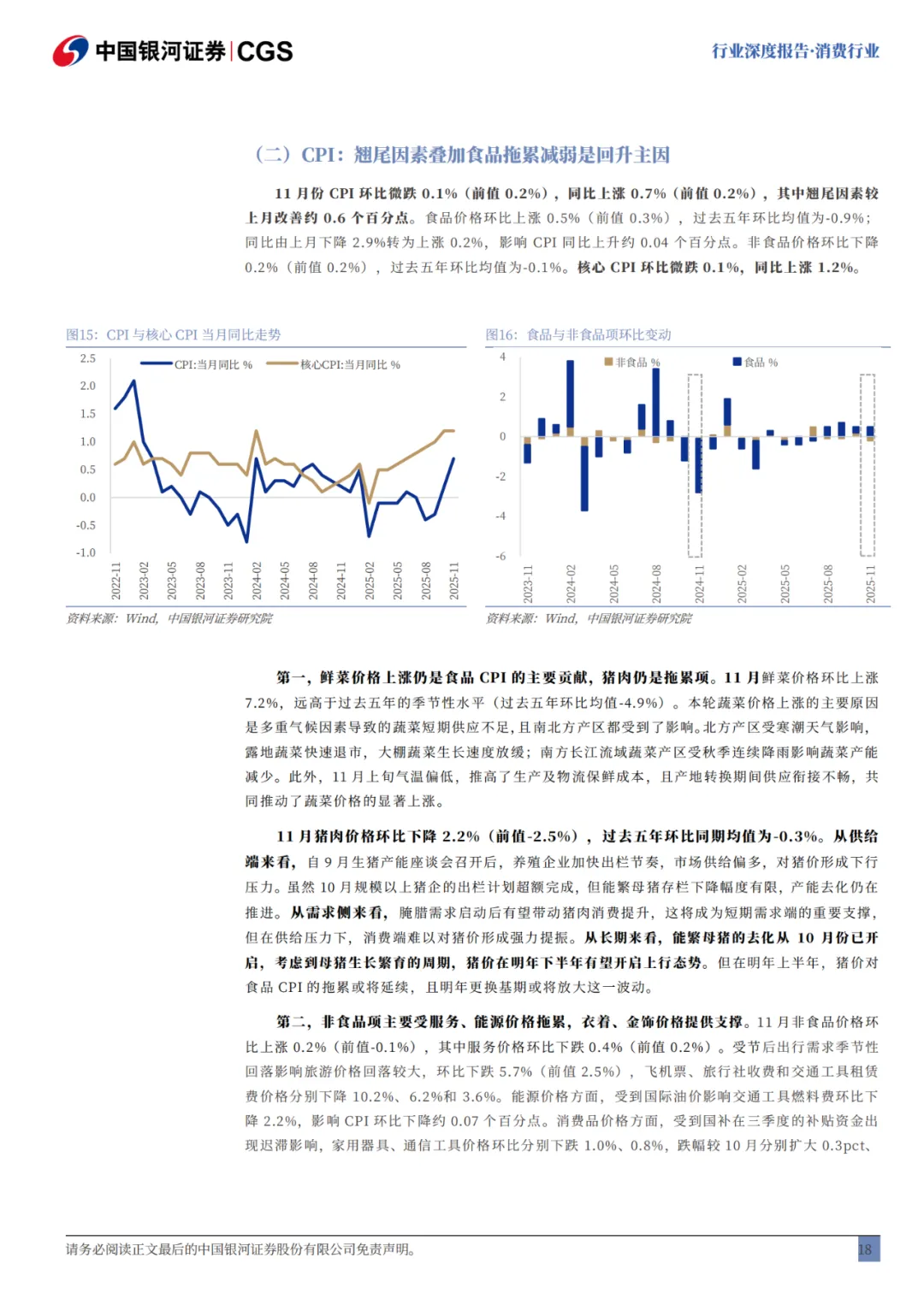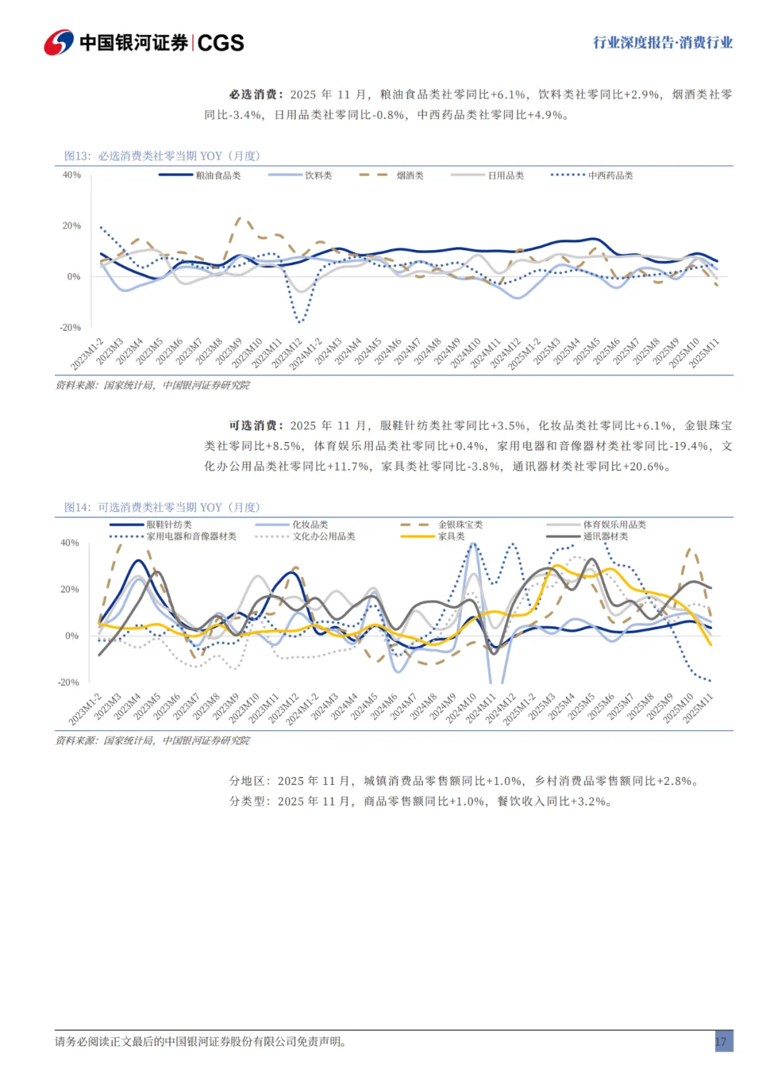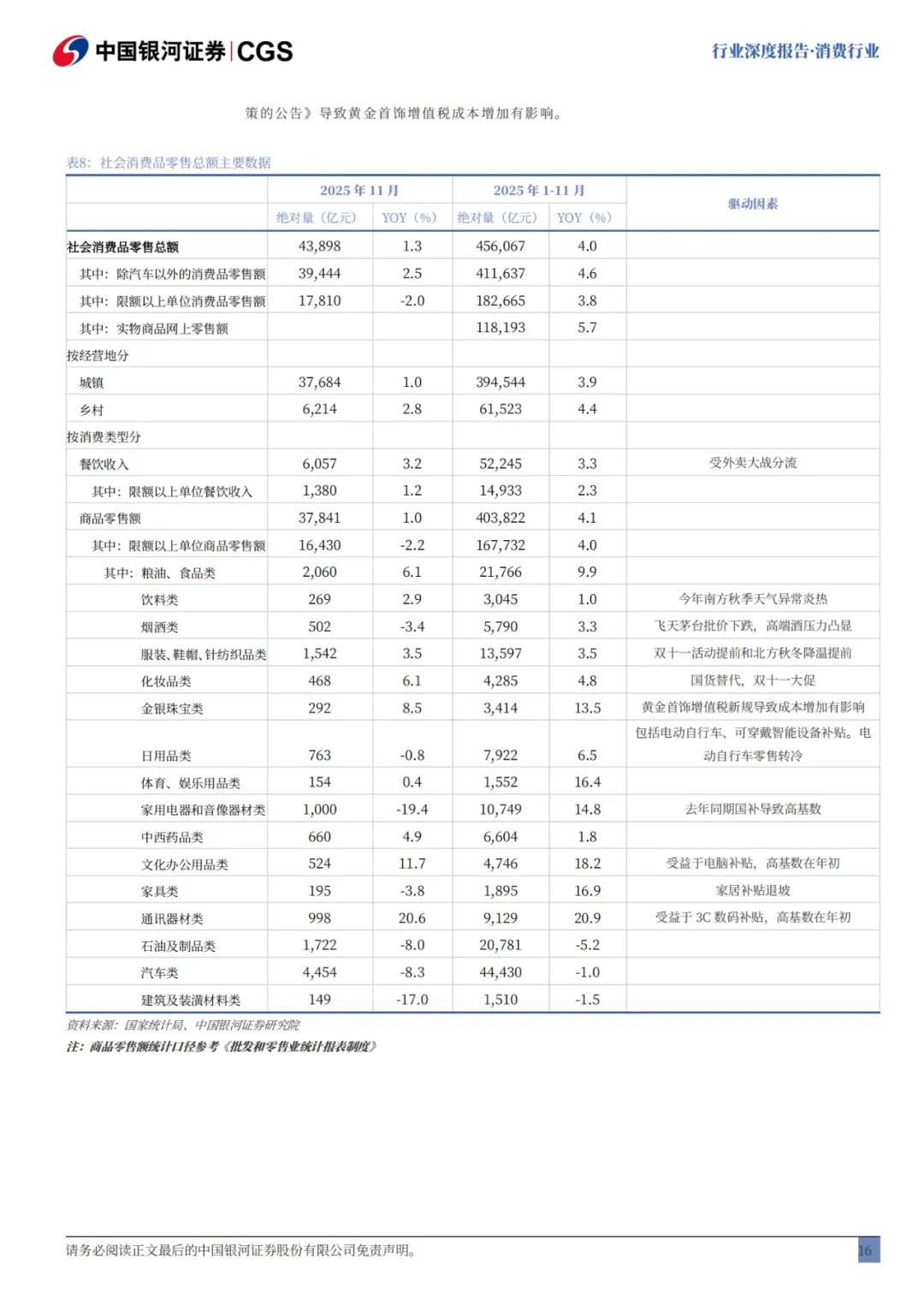 消费市场运行呈现分化特征。社零增速自2025年5月以来逐月环比下降,11月同比增长1.3%。国补退坡对家电等品类影响明显,家用电器和音像器材类社零同比下滑,但3C数码产品受补贴政策优化带动保持增长。金银珠宝类受金价上涨和税收政策影响实现大幅增长,服装、化妆品、餐饮等品类保持稳定增长态势。