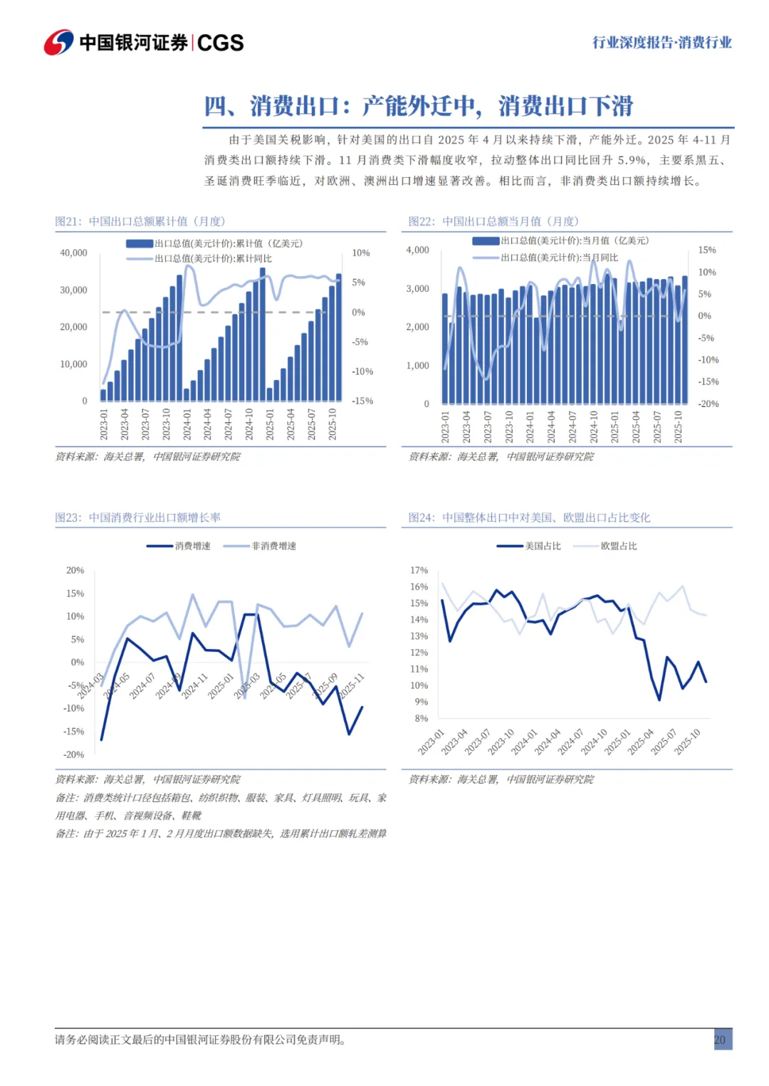 消费板块估值方面,A股和港股消费行业多数子板块估值处于历史低位,机构配置呈现结构调整特征,港股新消费领域获得更多关注。整体来看,消费行业在政策支持与市场变化的双重作用下,呈现出结构优化、海外突围的发展态势。