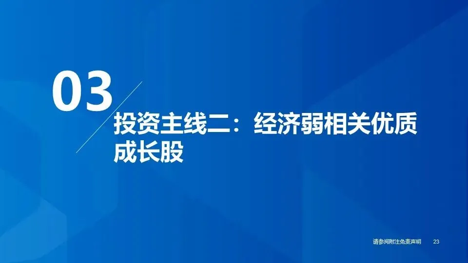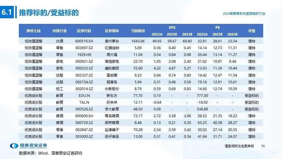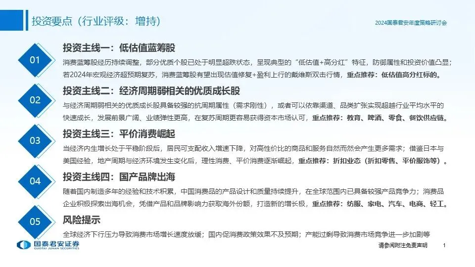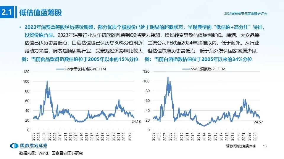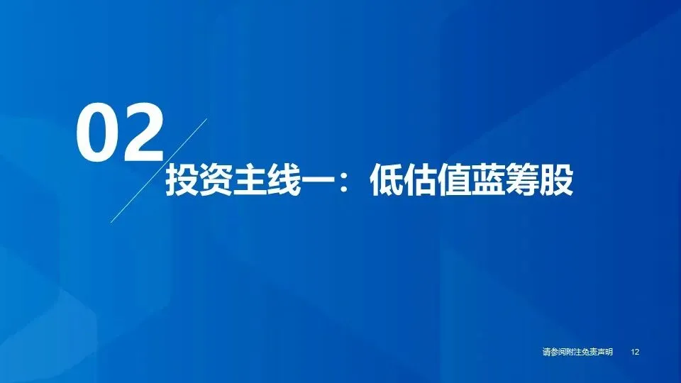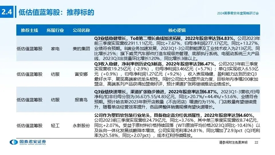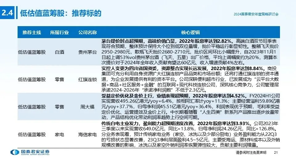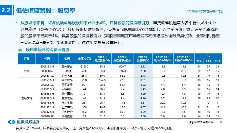 ①投资主线一(低估值蓝筹股):消费蓝筹股经历持续调整,部分优质个股已处于明显的超跌状态,呈现典型的“低估值+高分红”特征,防御属性和投资价值凸显,若2024年宏观经济超预期复苏,消费蓝筹股有望出现估值修复+盈利上行的戴维斯双击行情,重点推荐:低估值高分红标的。