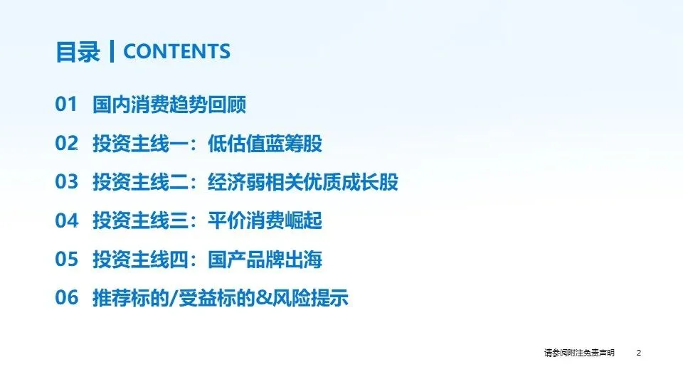 风险提示:全球经济下行压力导致消费市场增长速度放缓;国内促消费政策效果不及预期;产能过剩导致消费市场竞争进一步加剧等。