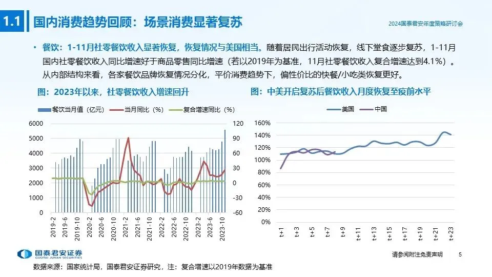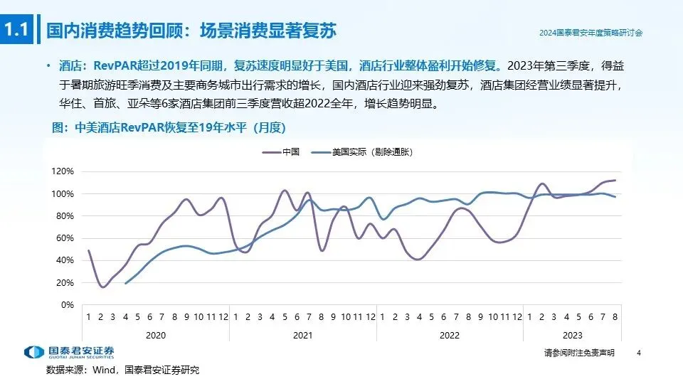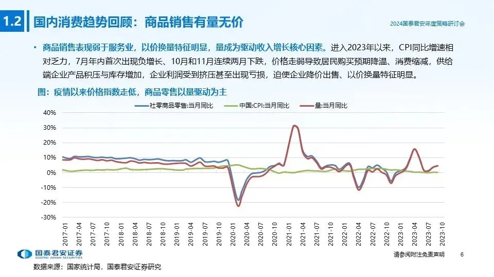 回顾2023年,在疫后复苏的大背景下,服务业(酒店、餐饮)出现明显好转,商品销售表现稍弱,企业承压被动去库,以价换量特征明显。2023年是三年新冠疫情防控转段后经济恢复发展的一年,我国经济回升向好,高质量发展扎实推进。各类场景类消费复苏带动下,服务业出现明显好转,酒店RevPAR超过2019年同期,复苏速度好于美国;餐饮行业收入增速回升,线下堂食逐步复苏。不同于服务业,商品销售表现稍弱,量成为驱动收入增长核心因素。2023年CPI同比增速相对乏力,7月年内首次出现负增长、10月和11月连续两月下跌,价格走弱导致居民购买预期降温、消费缩减,供给端企业产品积压与库存增加,迫使企业降价出售、以价换量特征明显。