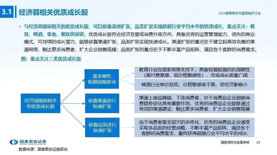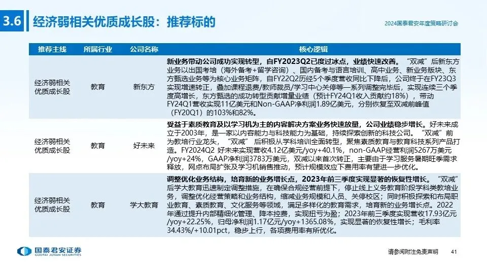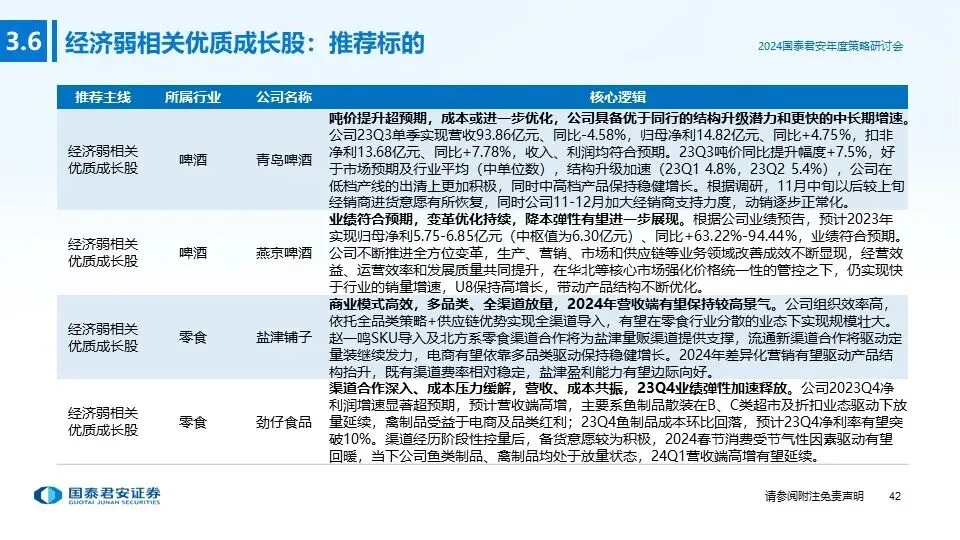 ②投资主线二(经济周期弱相关的优质成长股):与经济周期弱相关的优质成长股,通常具备较强的抗周期属性(需求刚性),或者可以依靠渠道扩张、品类扩张实现超越行业平均水平的快速成长,发展前景广阔、业绩弹性更高,在复苏周期更容易获得资本市场认可,重点推荐:教育、啤酒、零食、餐饮供应链。