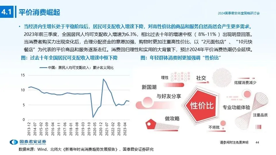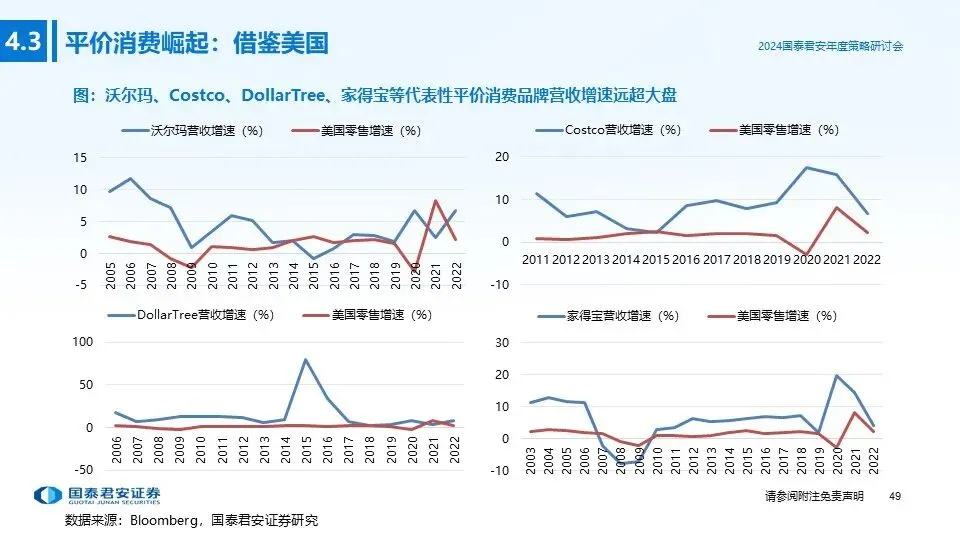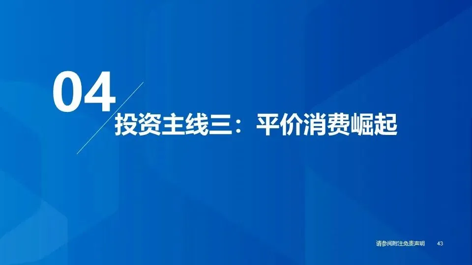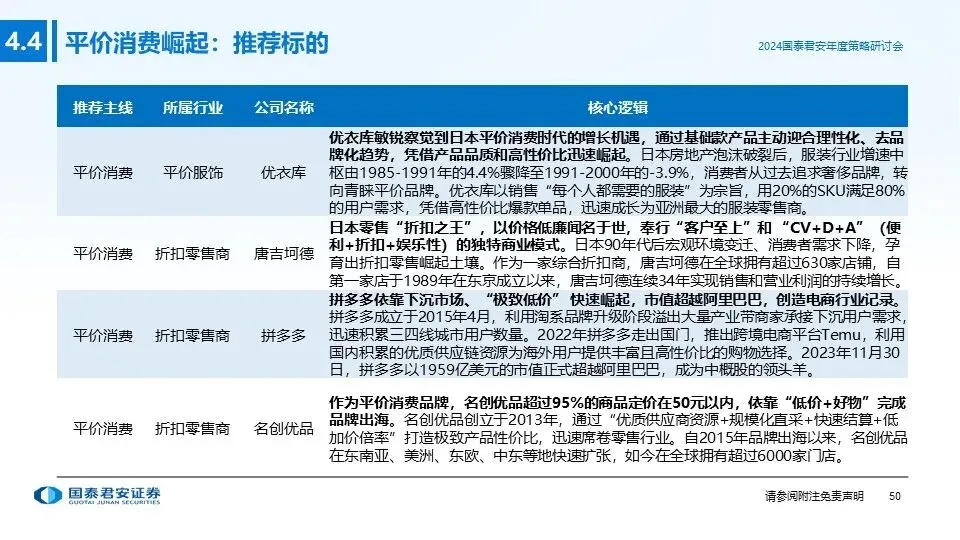 ③投资主线三(平价消费崛起):当经济内生增长处于平稳阶段后,居民可支配收入增速下降,对高性价比的商品和服务自然而然会产生更多需求;借鉴日本与美国发展经验,房地产周期与经济环境发生变化后,理性消费、平价消费逐渐崛起,重点推荐:折扣业态(折扣零售、平价服饰等)。