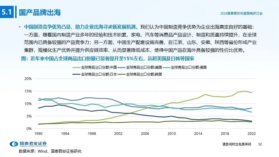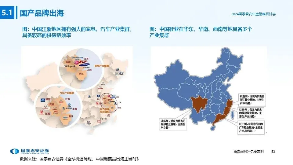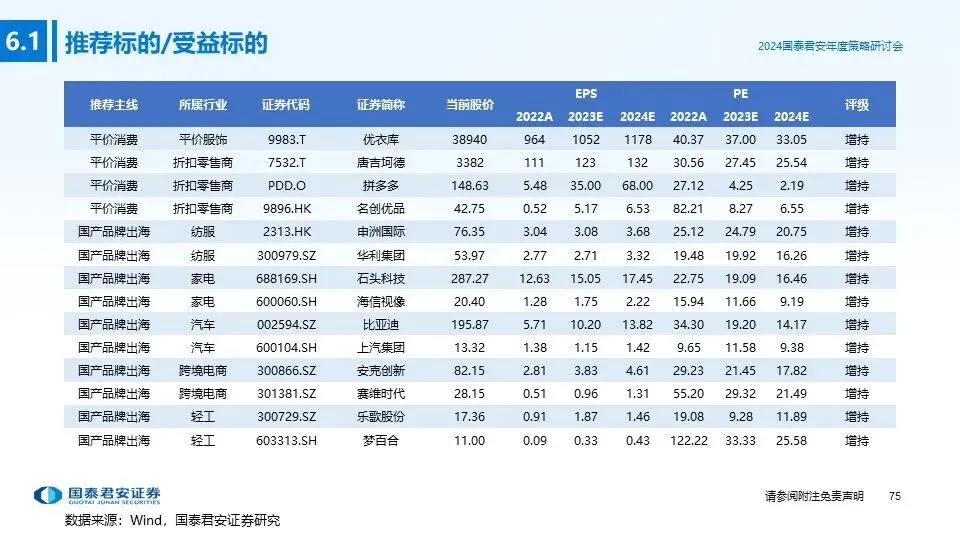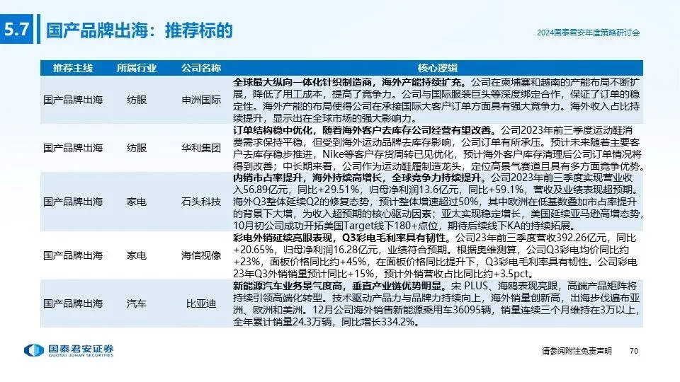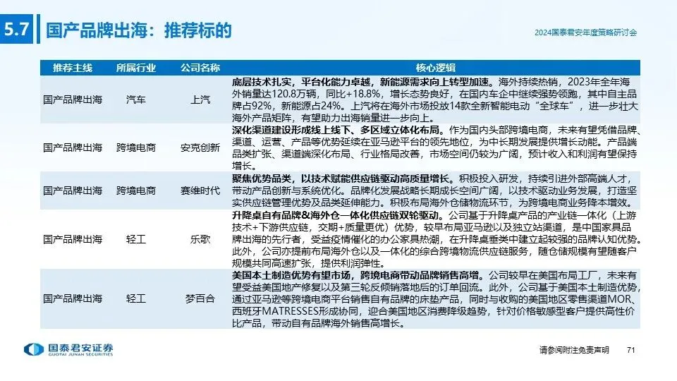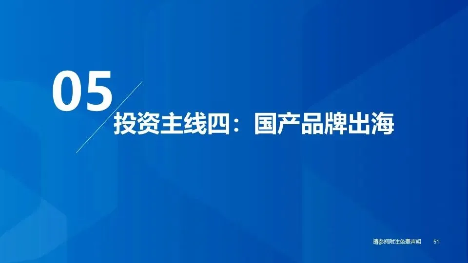 ④投资主线四(国产品牌出海):随着国内制造产业多年的经验和技术积累,中国消费品的产品设计和质量持续提升,在全球范围内已具备较强的产品竞争力;消费品企业积极探索出海机会,凭借产品和品牌影响力获取海外份额,打造新的增长极,重点推荐:纺服、家电、汽车、电商、轻工。