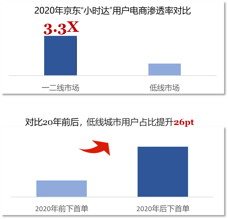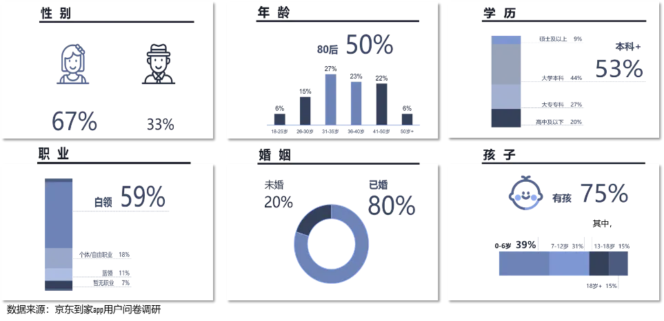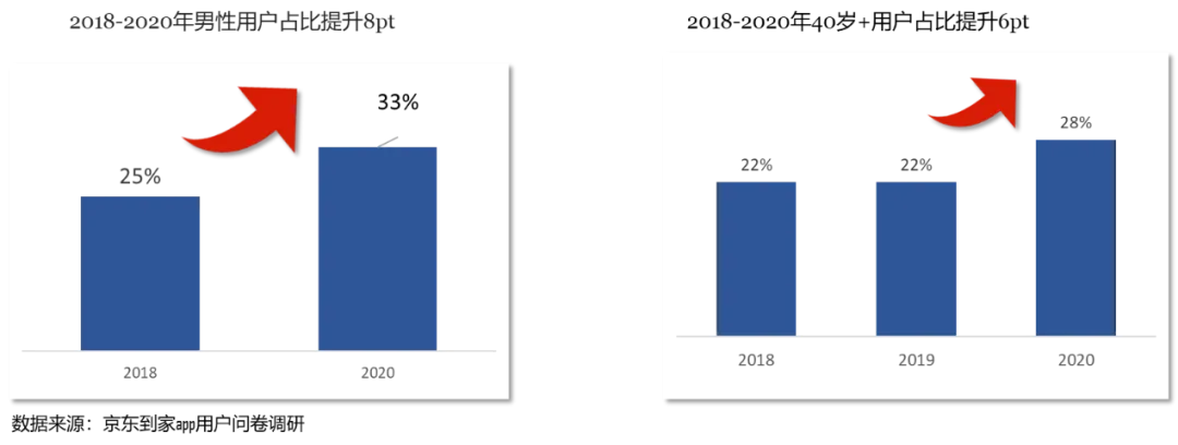 纵观中国互联网电商的整体发展,过去20年大致可以划分为三个阶段,从远距电商、近距电商再到微距电商时代。目前,中国零售电商正处于微距电商时代,以本地三公里之内的线下门店为基础,履约时效缩短至“小时达”。微距电商时代已来,买卖双方的距离被不断拉近,线上与线下渠道更加深度的融合,为消费者带来极具性价比的“即需、即买、即到、即享”体验。近年来,即时消费(到家业务)驱动整体O2O快速增长,Kantar预计2016-2021E复合增长率为64%,2021年市场规模达到两万亿规模。作为最早切入并持续深耕本地即时消费赛道的O2O平台,京东到家2020年交易额实现了三位数的高速增长,2021年京东618首日,京东到家平台销售额同比增长超140%。即时消费快速增长的同时,也向着全客群、全地域、全品类、全诉求、全场景、全天候、全渠道、全触点、全服务、全速达等“十全”方向全面开花。年轻女性一直是即时消费的核心群体。京东到家用户调研显示,80后已婚职场妈妈是到家平台购买力最强劲的群体,她们高等学历,白领居多,中薪水平。同时,即时消费用户向更多元和全面的客群拓展。2018-2020年,京东到家男性用户和40岁+用户占比显著提升,其中男性用户占比提升8%,40岁+用户占比提升6%。全地域:从五环内到低线市场,从发达地区到覆盖中西部