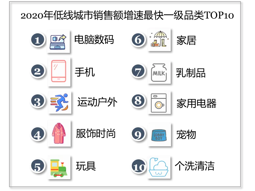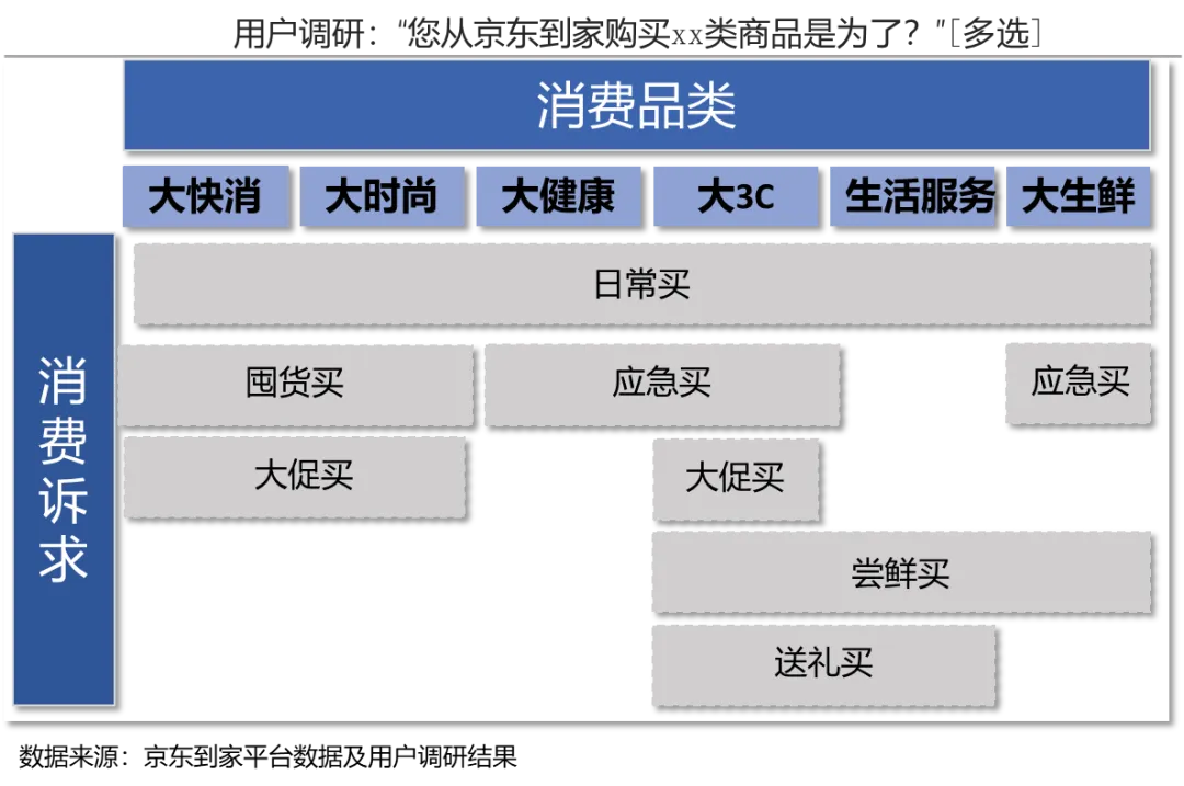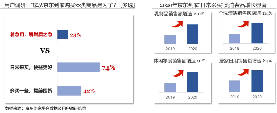 目前,即时消费在一二线城市的发展已经愈发成熟。京东大数据显示,2020年京东“小时达”用户在一二线市场的电商渗透率是低线市场的3.3倍。与此同时,即时消费在低线市场爆发增长,从五环内向低线市场快速推进,对比2020年前后,京东到家平台低线城市用户占比提升26%。即时消费所覆盖地域范围逐步扩大,更多低线市场的消费者享受到1小时达服务的方便快捷。2021年第一季度,京东到家覆盖全国超1500个县区市,同比去年逾翻倍。在低线市场,2020年即时消费销售额增长最快的TOP10城市中,有4个来自四川,2个来自安徽。前三名分别为四川资阳、四川泸州和浙江湖州。从细分品类来看,电脑数码、手机、运动户外、服饰时尚和玩具等品类在低线市场的销售额增长最快。同时,即时消费正在覆盖更多的中西部地区。目前,达达快送目前已覆盖全国2700个县区市,南到海南三亚、北至黑龙江佳木斯,都活跃着达达快送骑士的身影。2020年,京东到家订单量最高的三个地区是华南、华北和西南,占比近7成。在中西部地区中,西南的订单量占比近2成,超过华东位居第三。其中,四川是即时消费的大省,订单量占比近1成。从京东到家各地区订单量的增长来看,2020年增长最快的5个省份分别是山西、江西、吉林、贵州和河南,即时消费从发达地区不断向中西部和东北等地区全面覆盖。即时消费正在从以生鲜快消为核心,向全品类拓展。2020年,无论从订单量还是销量来看,食品饮料、生鲜、家庭清洁、个人护理等生鲜快消品都是即时消费的核心品类。从各品类的增长来看,2020年,京东到家销售额增长最快的一级品类是上门服务,其次是珠宝配饰、电脑数码、手机、运动户外等,即时消费向全品类拓展。其中,手机1小时达已经成风尚。2021年京东618首日,京东到家平台上手机销售额同比增长1500%,全国超500个县区市的用户在1小时内收到手机产品,其中iPhone12热卖,销量环比增幅超200%。同时,京东到家平台美妆品类销售额超去年同期2倍,洁肤用品销售额超去年同期4倍。即时消费早已不仅仅是用户的应急选择。京东到家用户调研显示,购买原因中选择“着急用”的用户仅占23%,而74%用户的购买原因是“日常采买”,42%用户的购买原因是“囤货”。即时消费平台已经日趋成为用户日常采买、囤货补给的重要渠道,各种典型日常采买的消费品类,如乳制品、个洗清洁、休闲零食和母婴等增长显著。从细分品类来看,大快消和大时尚品类更倾向“囤货买”和“大促买”,大健康(医药用户)的“应急”需求最突出,大3C的消费诉求更加多元,“应急”、“大促”、“尝鲜”和“送礼”等都是选择即时消费的原因。即时消费也早已不仅仅局限在送货“到家”的场景,向行政机构、酒店、写字楼等区域拓展,即时消费的场景更加多元、也更加全面。
