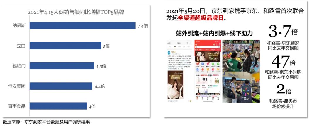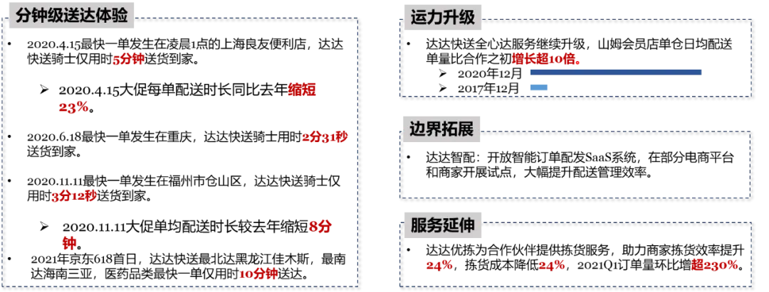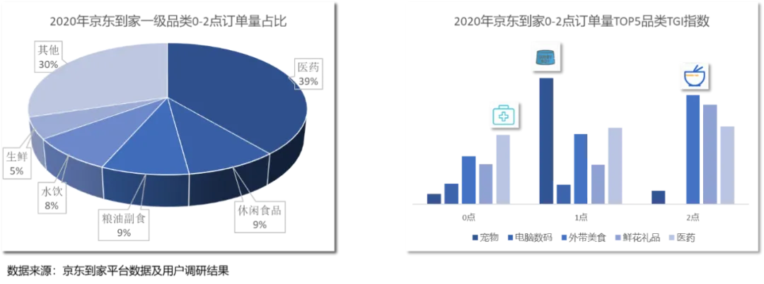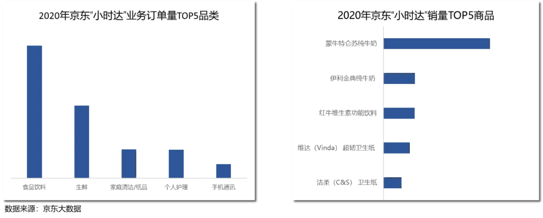 2020年,到家(住宅/小区)仍是即时消费的核心场景,占比超过7成,同时行政机构和酒店宾馆等场景的即时消费订单量在迅速增长。即时消费用户更偏好在“朝九晚八”下单。京东大数据和京东到家平台数据显示, 2020年,京东到家用户在早上8点到晚上20点这一时间段订单占比显著高于京东主站用户,同时凌晨0-2点的熬夜下单量增长显著,即时消费逐渐向全天候消费拓展。从熬夜(凌晨0-2点)下单购买的品类来看,其中近4成的订单购买的是医药,其次是休闲食品和粮油副食。从具体时间段来看,凌晨0点是医药的下单高峰,凌晨1点宠物相关的即时消费订单最多,凌晨2点是外带美食的下单高峰。目前,京东到家与沃尔玛、永辉、华润万家等全国连锁超市达成深度合作,商超销售额实现快速增长。同时,品牌商与即时零售平台的合作也越来越紧密,成为品牌商的营销新引擎,品牌营销走向全渠道。2021第一季度,京东到家品牌广告收入同比增超130%。2021年4.15大促当天,京东到家合作品牌总销售额达去年同期3倍,其中合作品牌通过京东到家产生的包含京东、线下门店等全渠道销售额,环比3月同期增长近6倍。即时消费的触点更加多元化。京东到家用户调研显示,除到家站内之外,线下实体店和导购推广员已经成为用户获取到家信息的重要渠道。为了满足用户多样化的需求,即时消费迈向全品类时代,同时也在不断拓展各种附加服务,让3C服务、家政保洁、家装服务等也能1小时到家。京东到家积极拓展服务边界,在3C领域,成为全国首个实现在线办理合约机业务的O2O平台;而在医疗健康领域,已陆续上线医美、体检、慢病服务等服务项目。从服务消费的细分品类来看,“大健康”和“大3C”类的服务消费占比最高,其中体检、中医养生、手机维修、手机保障服务和电光美容最受欢迎。在京东到家上门服务中,3C服务的占比也最高,占85%。从即时消费的服务销售额来看,北京、成都、重庆、武汉和上海的用户最喜欢购买即时消费的各项服务。在低线市场中,四川绵阳、甘肃兰州、山东泰安的即时消费服务销售额最高。即时消费模式下,用户可根据具体位置选择附近门店下单,你家楼下的便利店、社区超市极有可能就是发货的门店,“楼上下单,楼下发货”的模式催生“分钟级配送时代”的到来。2020年全年,达达快送即时配送服务平均配送时长约30分钟。即时消费模式下的商品,正以越来越快的速度送到消费者手中。不断优化成本、效率、体验,是京东持续践行的“第一性原理”,也是所有商业最核心的本质。只有大幅降低零售成本,提升零售效率,最后才能反哺品牌商和渠道商,让他们有更好的利润和现金流去满足消费者的需求,提升消费者的体验,整个供应链进入良性的发展过程,实现整个产业的高质量发展。即时零售的“第一性原理”同样也是优化成本、效率、体验。对于消费者来说,即时零售通过向全品类、全诉求、全场景、全天候、全触点、全服务、全速达等方向拓展,让更多消费者可以享受到高效的购物体验,让“万物即时可得”。对于合作伙伴而言,即时零售助力线下实体零售和品牌商降本增效,提升线下存量业务经营效率,开辟线上增量业务,提升全渠道的运营能力。北国超市事业部副总经理郝俊红表示:“消费者对于即时消费的需求不可逆转,从效果、成本、履约的顾客体验等方面,我们对即时消费的未来充满信心。”从行业和全社会的角度,即时零售的社会价值体现在以下三个方面:首先,通过连接线上和线下场景,提升从数字经济到实体经济全渠道生产要素的匹配效率;其次,优化了从消费端到产业端全链路的成本和效率;最后,通过数字化转型等技术服务,给包含大量中小企业在内的线下实体零售带来数智化升级支撑。即时消费无疑是全渠道模式高质量发展的核心载体之一。达达集团在战略承接京东即时零售和即时配送业务后,将更加深度融合双方优势,京东海量的优质用户、优质的品牌形象、在大数据和科技方面的深厚积累,结合达达集团在即时零售领域的商家资源、经验、数字化赋能能力。目前,达达集团与京东集团携手加速即时零售的全面拓展,共同迈向“万千好物,即时可得”的时代,持续优化行业的成本、效率和体验,为消费者、合作伙伴、行业乃至全社会创造更多的价值。
