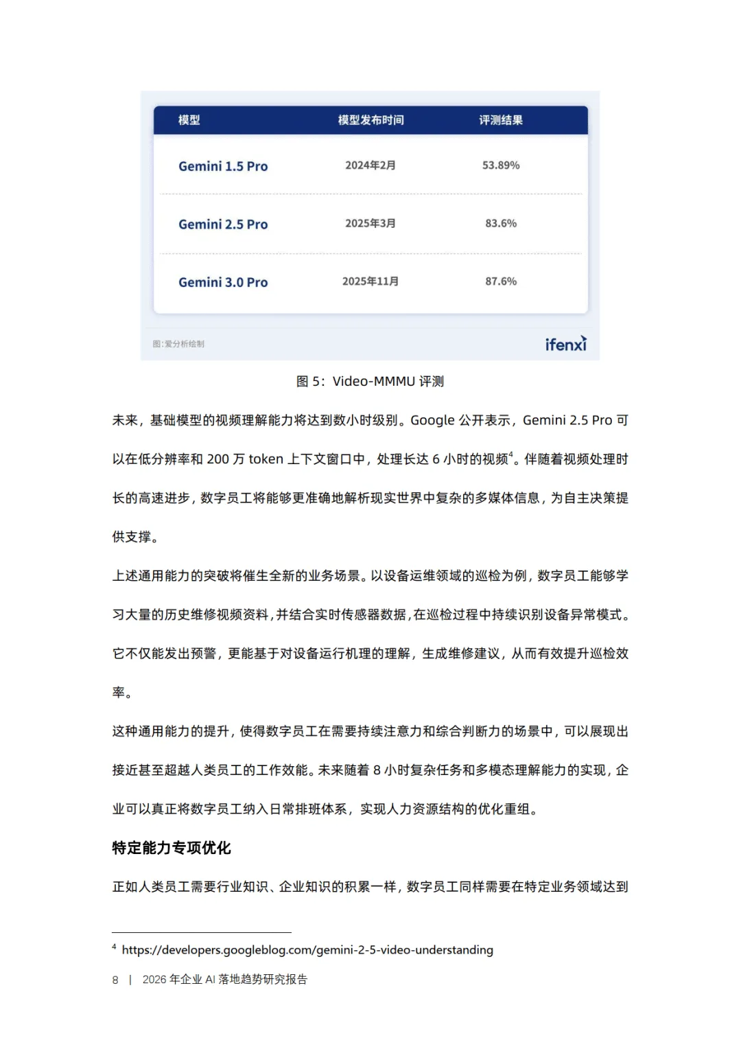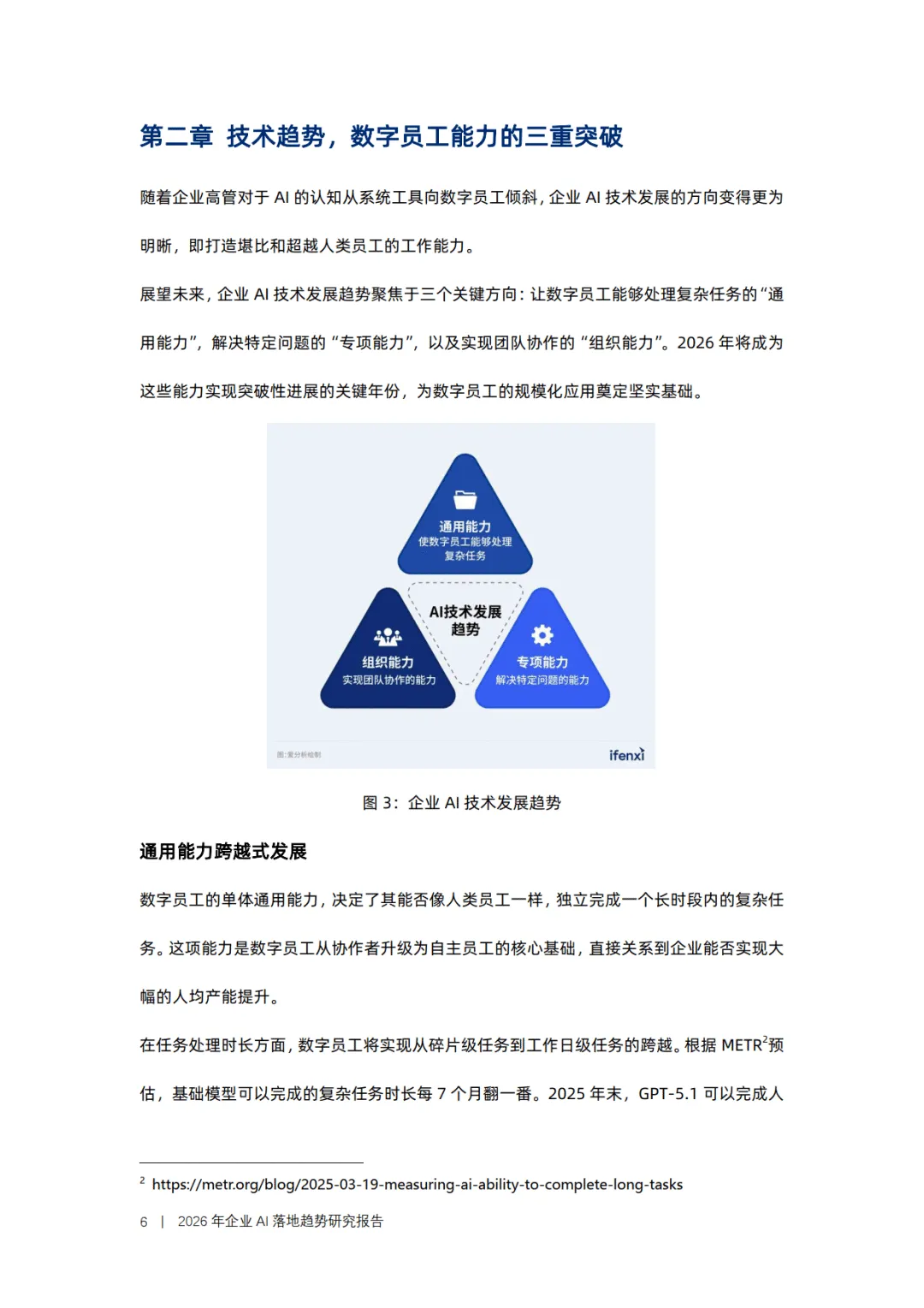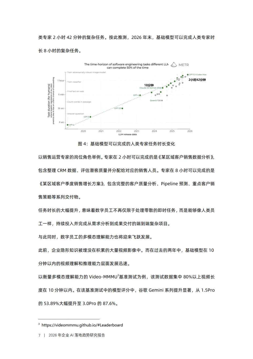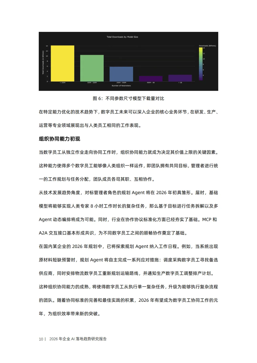 技术层面,数字员工能力将实现三重突破。通用能力上,2026 年末基础模型可完成人类专家 8 小时级复杂任务,多模态理解能力拓展至数小时级视频解析,支撑端到端复杂项目落地;专项能力上,特定场景模型向 “专且小” 演进,OCR 等模型参数缩减至 1-3B,结合知识图谱与 RAG 技术解决幻觉问题,开源模型生态降低企业部署成本;组织能力上,规划 Agent 雏形初现,依托标准化协作协议,实现多数字员工协同完成复杂流程。