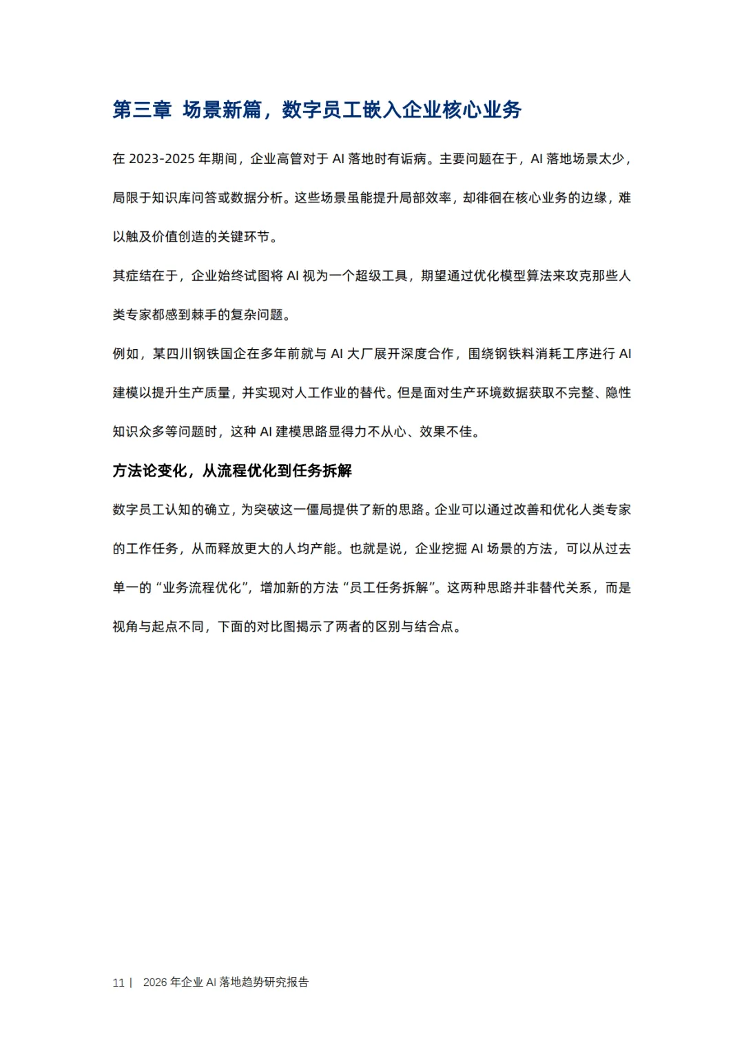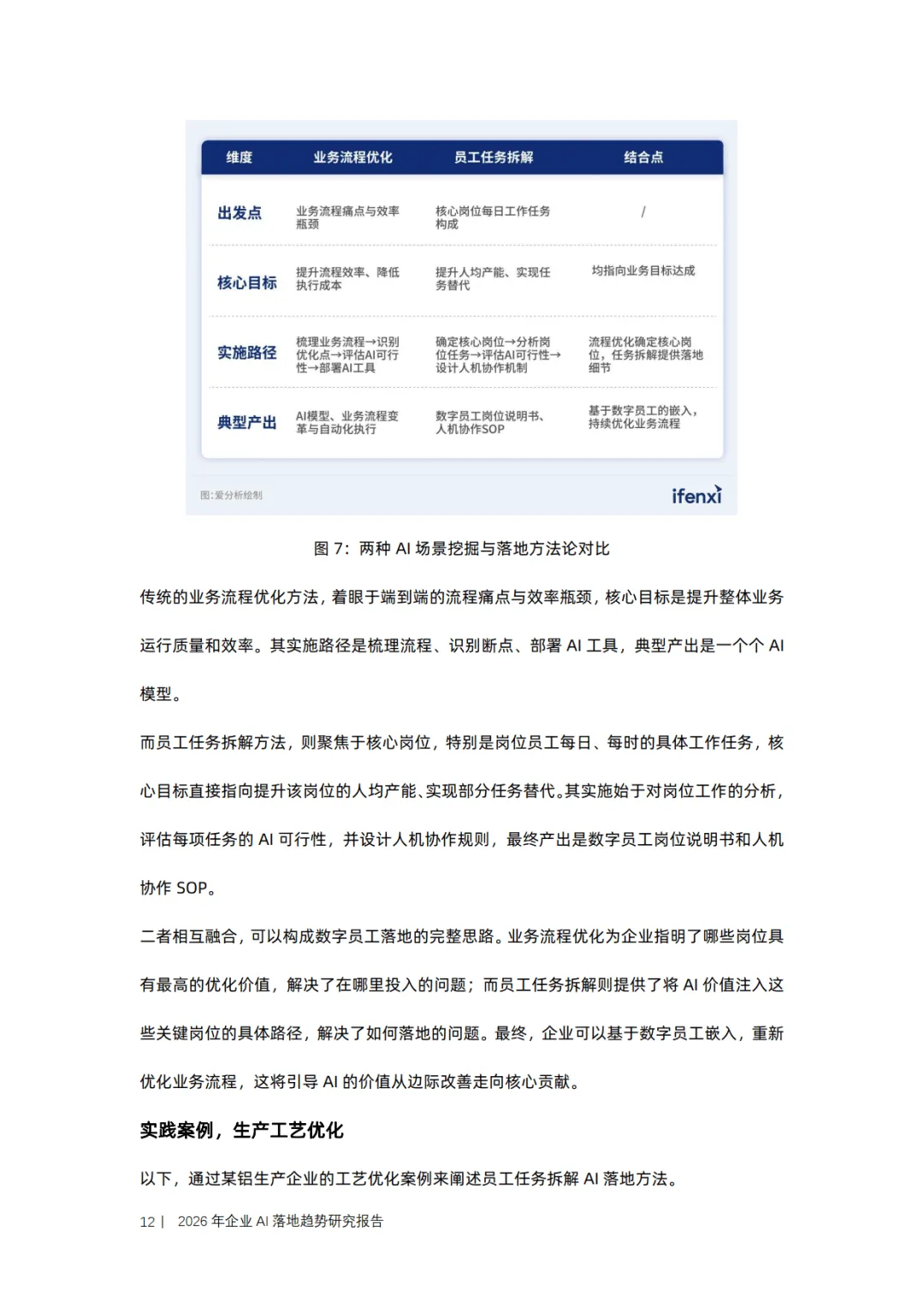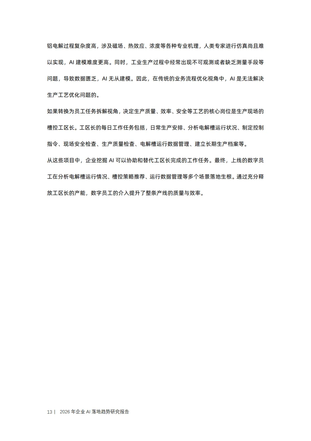 场景层面,AI 落地方法论从 “业务流程优化” 拓展至 “员工任务拆解”,二者融合形成完整落地路径。数字员工不再局限于边缘场景,而是嵌入生产、研发、运营等核心业务,例如铝生产企业通过拆解槽控工区长任务,让数字员工辅助工艺优化,提升产线效率与质量。
