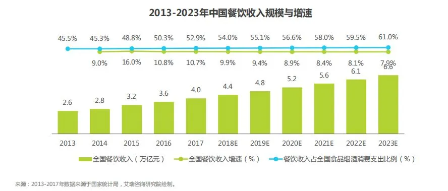 吃饭是满足人的基本生活需求之一,现在人的社交离不开吃饭,国家统计局数据显示,2017年,全国餐饮收入达4.0万亿元,同比增长10.7%。今年1月份至4月份,全国餐饮营业额达12736亿元,同比增长10.1%,持续保持了两位数增长。