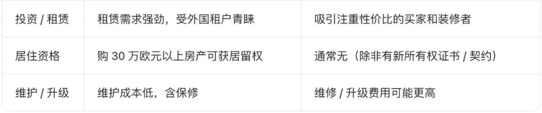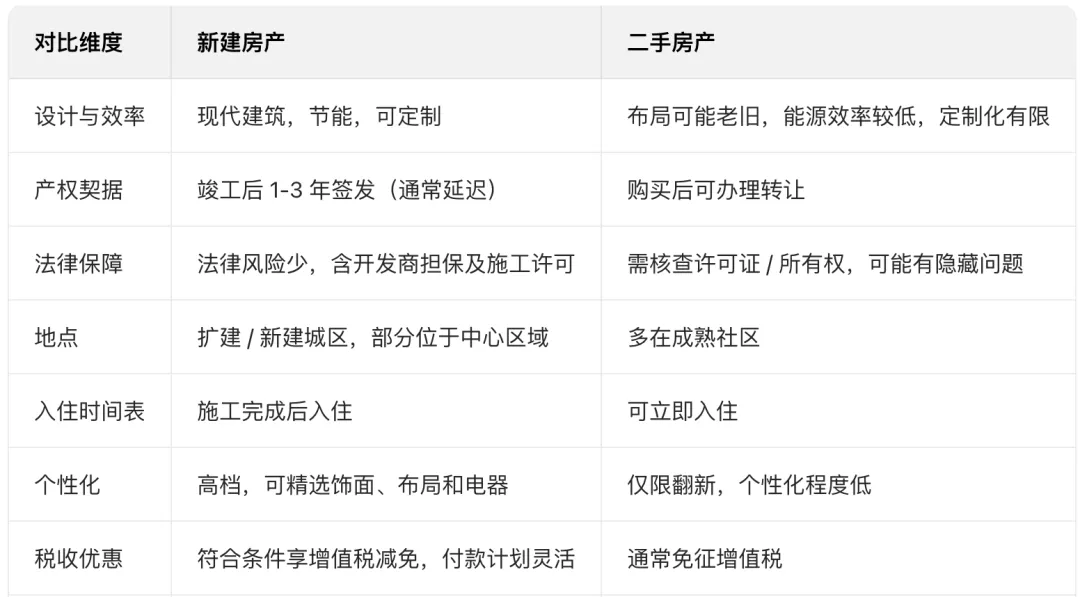 塞浦路斯的新建房产和二手房产在成本结构、设计、产权保障和投资优势方面存在显著差异。这些差异影响着购房者的偏好和在塞浦路斯房地产市场的投资策略。新建房屋提供现代化的生活环境、高能效、质量保证和居住资格,但会产生更高的成本,并且产权证的发放可能会延迟。 在塞浦路斯,选择新建房产还是二手房取决于买家的优先考虑因素。重视现代设计、低维护成本和投资潜力的买家可能更倾向于新建房产,而那些追求价格实惠或成熟地段的买家则可能发现二手房更具性价比。