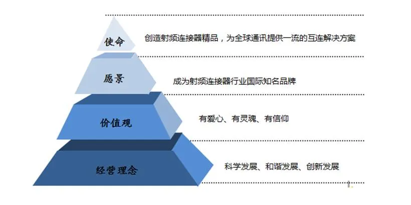 围绕“创造射频连接器精品、为全球通讯提供一流的互联解决方案”的企业使命,明确发展成为“ 射频连接器行业国家知名品牌”的企业愿景,塑造“有爱心、有灵魂、有信仰”的价值观,秉承“科学发展、和谐发展、创新发展”的经营理念。