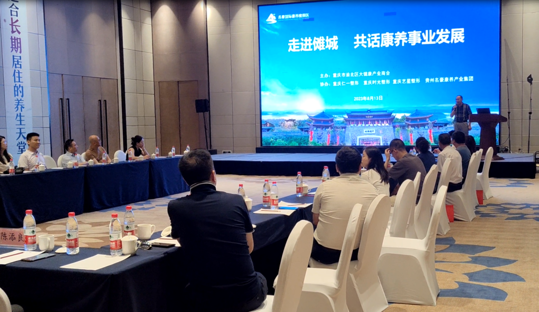 重庆市渝北区大健康产业商会领导班子成员和商会会员及渝北区工商联、重庆市大健康产业商会等相关领导及特邀嘉宾在参观完中国傩城盛大的开门迎宾仪式、国家级非遗祈福仪式,品尝了仡佬族千年食俗礼仪“三幺台”,近距离感受中国傩城源远流长的傩文化后,于温泉疗愈酒店出席了“走进傩城 共谋康养事业发展”的座谈会。