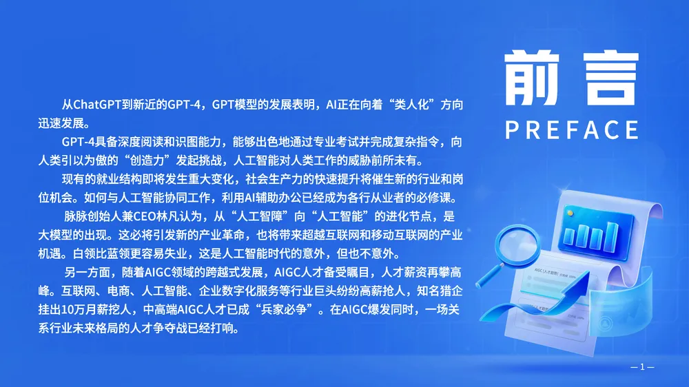 GPT-4具备深度阅读和识图能力,能够出色地通过专业考试并完成复杂指令,向人类引以为傲的“创造力”发起挑战,人工智能对人类工作的威胁前所未有。现有的就业结构即将发生重大变化,社会生产力的快速提升将催生新的行业和岗位机会。如何与人工智能协同工作,利用AI辅助办公已经成为各行从业者的必修课,从“人工智障”向“人工智能”的进化节点,是大模型的出现。这必将引发新的产业革命,也将带来超越互联网和移动互联网的产业机遇。白领比蓝领更容易失业,这是人工智能时代的意外,但也不意外。另一方面,随着AIGC领域的跨越式发展,AIGC人才备受瞩目,人才薪资再攀高峰。互联网、电商、人工智能、企业数字化服务等行业巨头纷纷高薪抢人,知名猎企挂出10万月薪挖人,中高端AIGC人才已成“兵家必争”。在AIGC爆发同时,一场关系行业未来格局的人才争夺战已经打响。