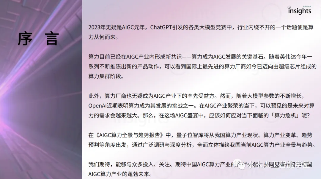 OpenAI近期表明算力成为其发展的挑战之一。在AIGC产业繁荣的当下,可以预见的是未来对算力的需求会越来越大。那么,在这场AIGC盛宴中,应该如何应对当下面临的「算力危机」呢?在《AIGC算力全景与趋势报告》中,量子位智库将从我国算力产业现状、算力产业变革、趋势预判等角度出发,通过广泛调研与深度分析,全面立体描绘我国当前AIGC算力产业全景与趋势。我们期待,能够与众多投入、关注、期待中国AIGC算力产业的伙伴一起,共同见证并打造中国AIGC算力产业的蓬勃未来。