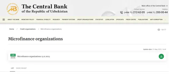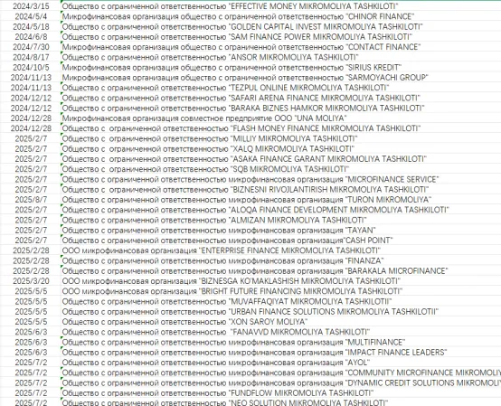 乌兹别克斯坦对贷款产品的监控⼒度是有的,会定期更新⼩贷组织的信息(最近更新数据时间为2025年7⽉)