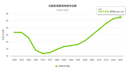 ⼈⼝:截⾄2025年12⽉,乌兹别克斯坦总⼈⼝约3705万,其中乌兹别克族占80%,其他⺠族包括俄罗斯族(5.5%)、塔吉克族(4%)等。⾸都塔什⼲⼈⼝约197万,是经济与⾦融中⼼。年龄中位数整体呈现先降后升的走势,2025年年龄中位数达到27岁。
