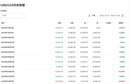 从数据可看出乌兹索姆在2025年7–9月延续下跌,9月创阶段低点前的弱势,9月单月大跌3.15%后,10–11月继续小幅下探至11,945.00;而后今年12月触底反弹,单月涨幅0.91%,收盘价回升至12,053.75,结束连续3个月的下跌,呈现升值态势。