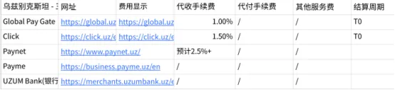 ⽬前状况:在有牌照之后,可接当地的三方支付(如Click ,Payme收付手续费都为1%),另有卡卡支付,收和付综合付费率大概在15%左右。