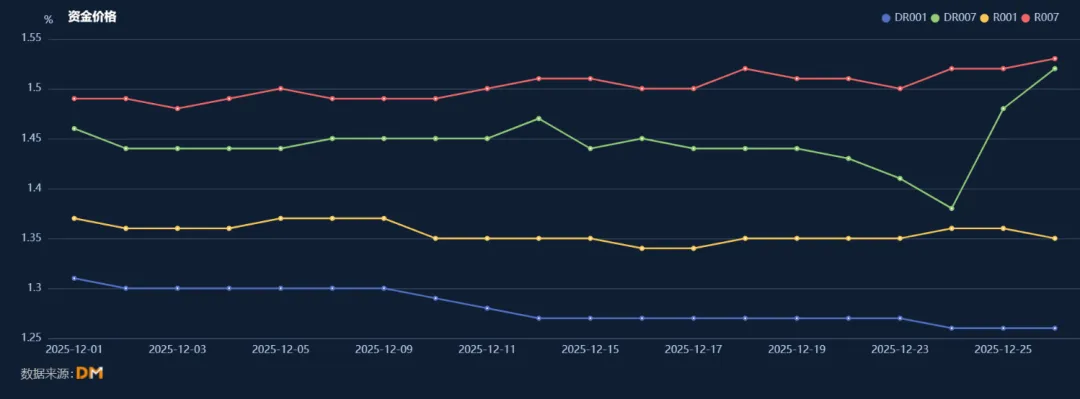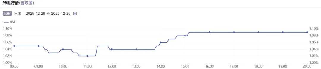 今日票据市场价格全天呈震荡上行走势,除1月到期票外,各期限均有不同程度的上行,整体市场交投冷清。早间开盘后,市场整体供过于求,价格逐步往上。其中,2月到期票以及足月票价格涨幅明显。午后市场依然寡淡,价格继续上行,至尾盘足月双国成交于1.08%附近。