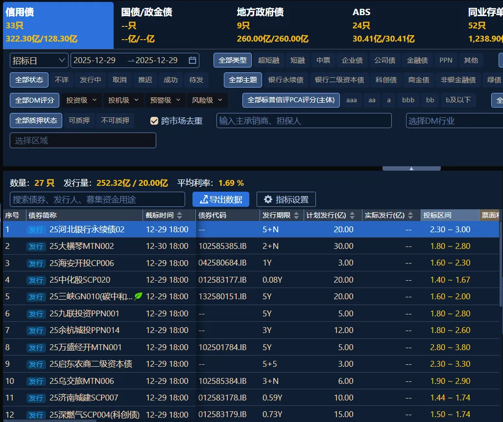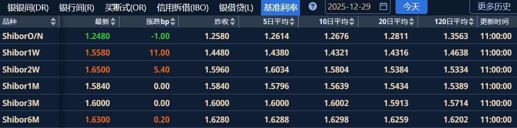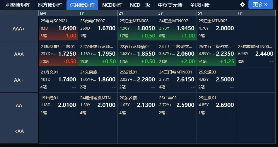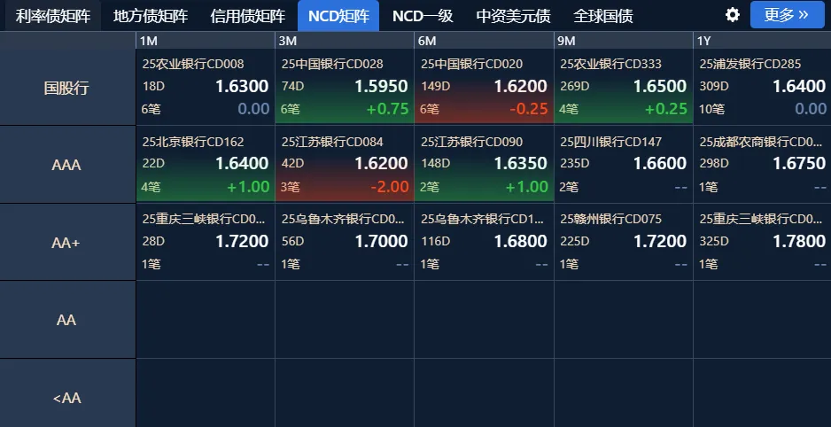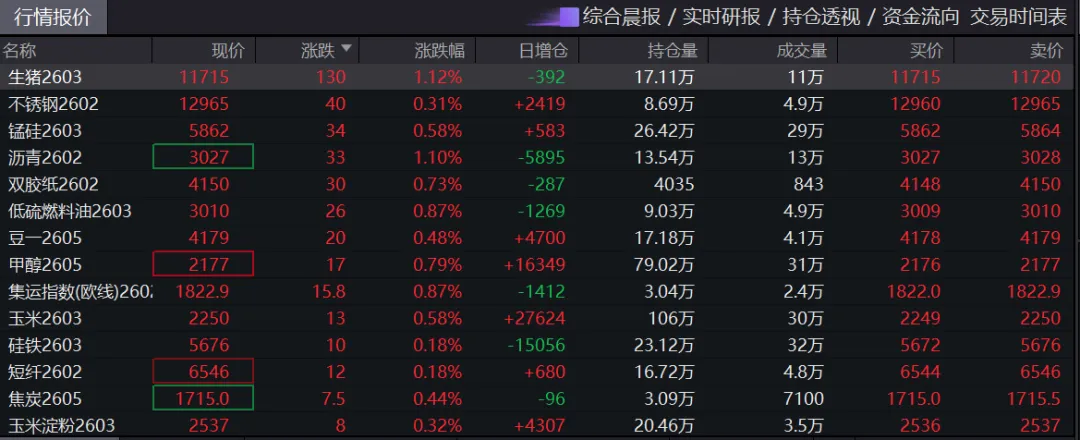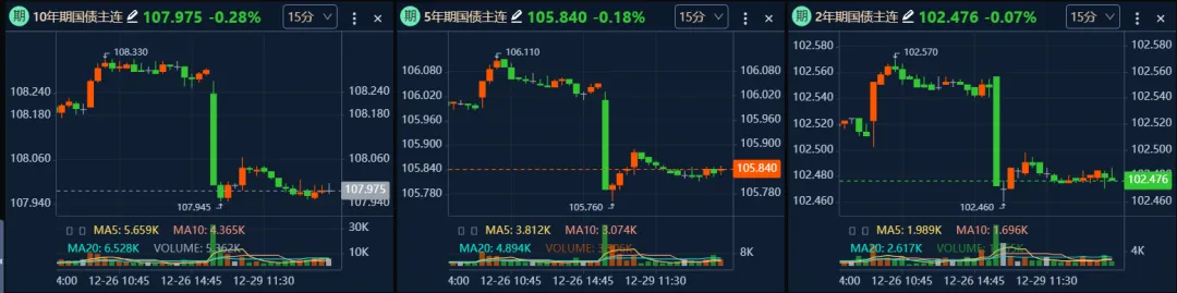 2年期国债期货主力合约TS2603下行0.07%至102.476,对应期货收益率上行4.49个基点至1.3285%;5年期国债期货主力合约TF2603下行0.18%至105.840,对应期货收益率上行4.89个基点至1.5504%;10年期国债期货主力合约T2603下行0.28%至107.975,对应期货收益率上行4.90个基点至1.7085%;30年期国债期货主力合约TL2603下行0.91%至111.820,对应期货收益率上行6.21个基点至2.3547%。