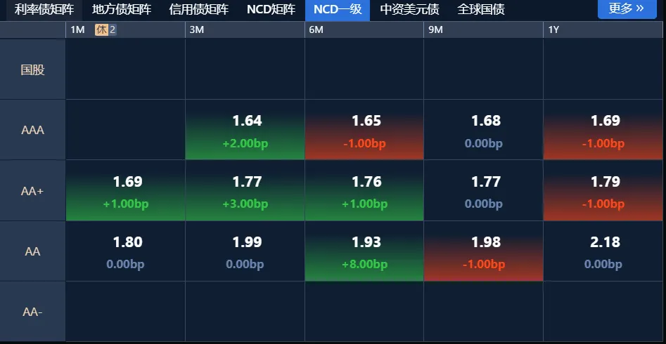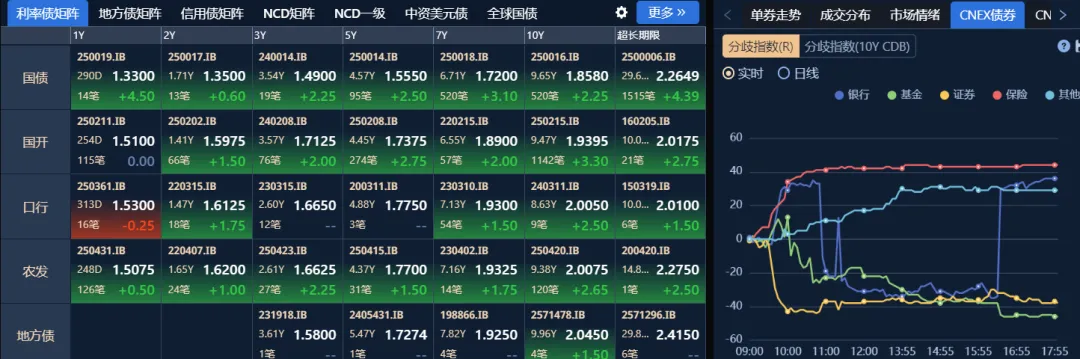 债券分歧指数看,日内交易盘为卖出主力,保险持续买入。债券市场交易有所增加,现券市场成交1.32万亿元,较前增加1.06%;10年期活跃国债和国开债分别成交在1.859%和1.939%,较前上行2.35BP和上行3.25BP。债券借贷市场成交1540.95亿元,较前增加5.09%。