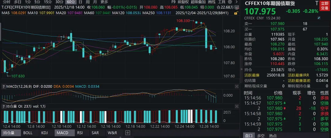 走势分析:今日CFFEX10年期国债期货开盘价108.235,收盘价107.975,最高点108.27,最低点107.94。MACD60分钟线看,今日的大阴线直接带动DIF线跌落到0轴线以下,DEA线仍0轴以上,但绿柱逐渐放大,短期偏空。K线图看,60分钟柱今日是3阴1阳,再度跌破MA250。