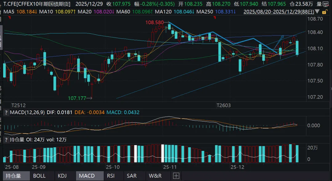国债期货开盘快速跳水,今日一只大阴线,K线(日线)在周末画的区间图里直接到了底线。如上周分析,此轮上行压力点位看108.35突破情况,不突破就难言进行右侧。108.2支撑不足则调整下行108或为下一支撑位,从今日收盘在107.975看,已经下破。最后2个交易日,预计行情清淡,多头势弱,观察107.9支撑情况。MACD日线看,DIF线和DEA线仍在0轴之上,两线拐头向下,仍在偏空区间,观察走势。