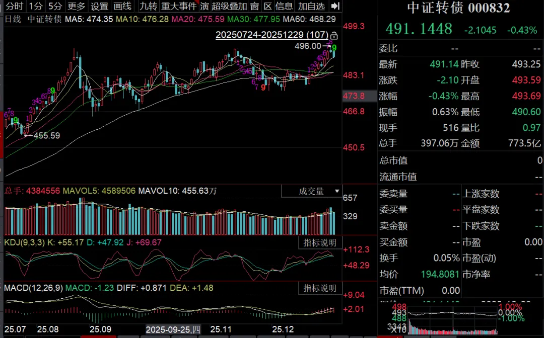 今日中证转债指数收盘下跌0.43%,报491.14点,成交金额773.50亿元。万得可转债等权指数收盘下跌0.35%,报239.72点。其中,再22转债、华医转债、漱玉转债、嘉美转债、北港转债跌幅居前,分别跌6.94%、6.53%、5.98%、5.77%、4.71%;天创转债、聚隆转债、航宇转债、豪美转债、伟测转债涨幅居前,分别涨9.79%、8.99%、5.50%、4.34%、3.7%。