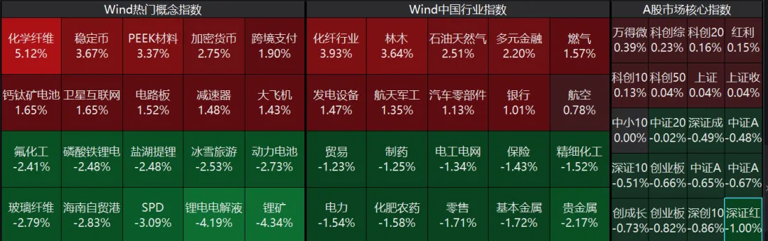 碳纤维概念走高,日本东丽宣布将上调碳纤维产品价格。脑机接口概念表现活跃;商业航天概念强势不改,上交所明确商业火箭科创板上市新规;人形机器人概念持续发酵;稳定币指数午后崛起,今年加密行业并购总额超过前四年的总和。锂电池产业链深度调整,海南自贸区题材下挫。