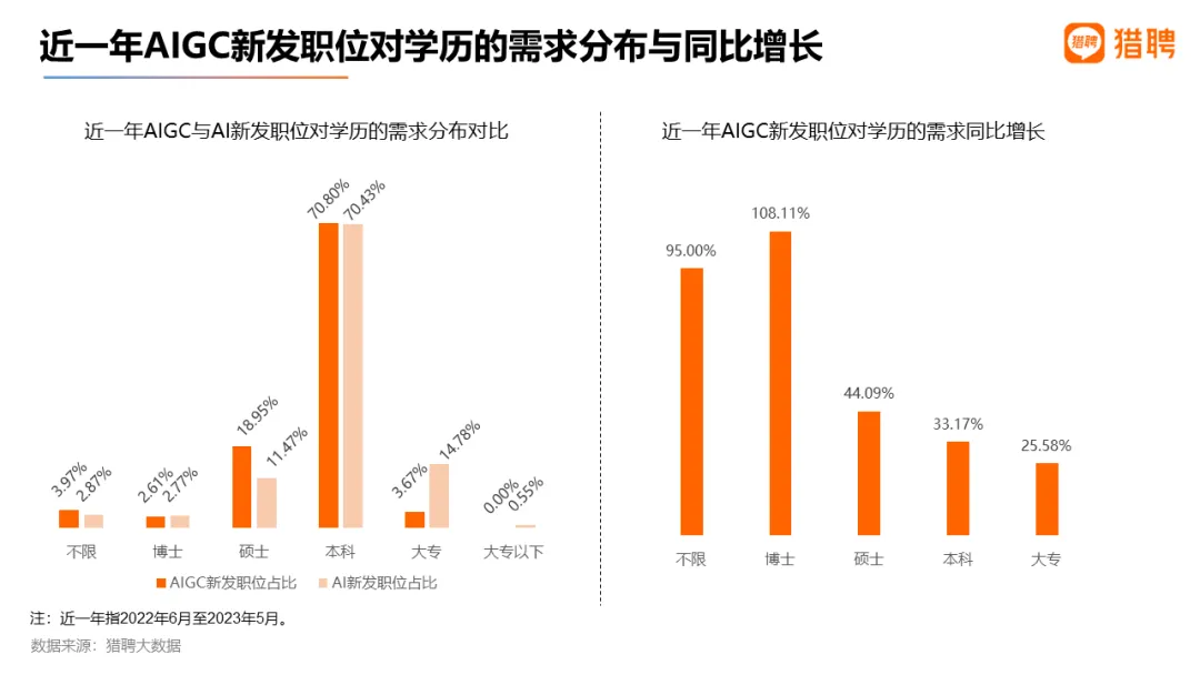 在对高学历需求方面,AIGC明显高于AI,前者对硕博的需求占比合计21.56%;后者为14.24%。