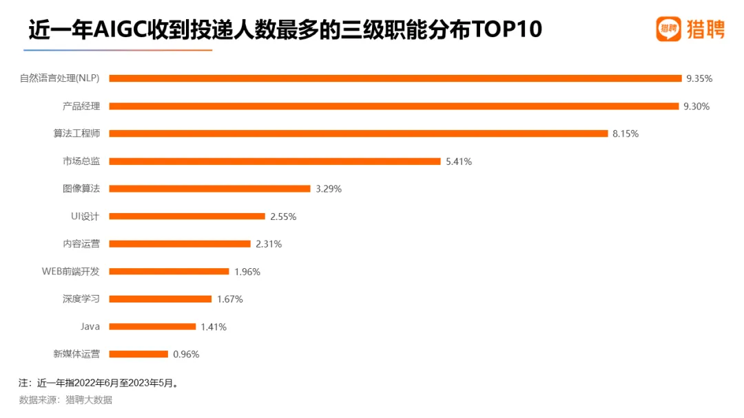 2. 投递AIGC领域自然语言处理和产品经理的人最多,占比合计近20%