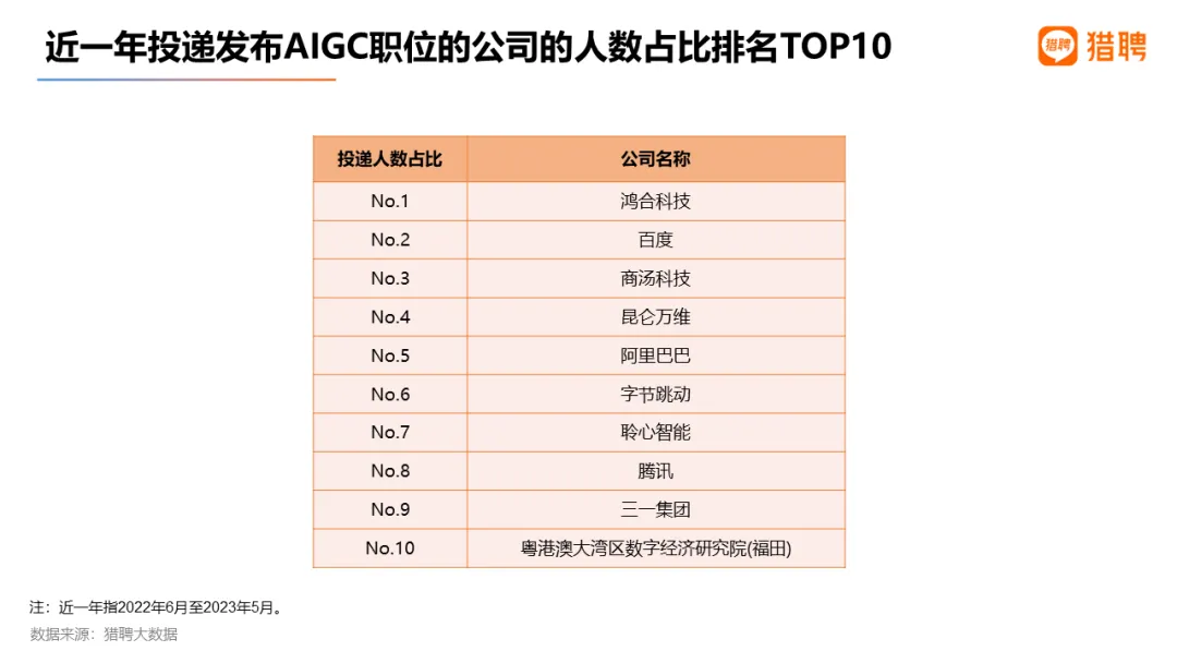 制造业公司三一集团位居第九。由此可见,求职者投递AIGC职位的人数集中于互联网和人工智能类公司。